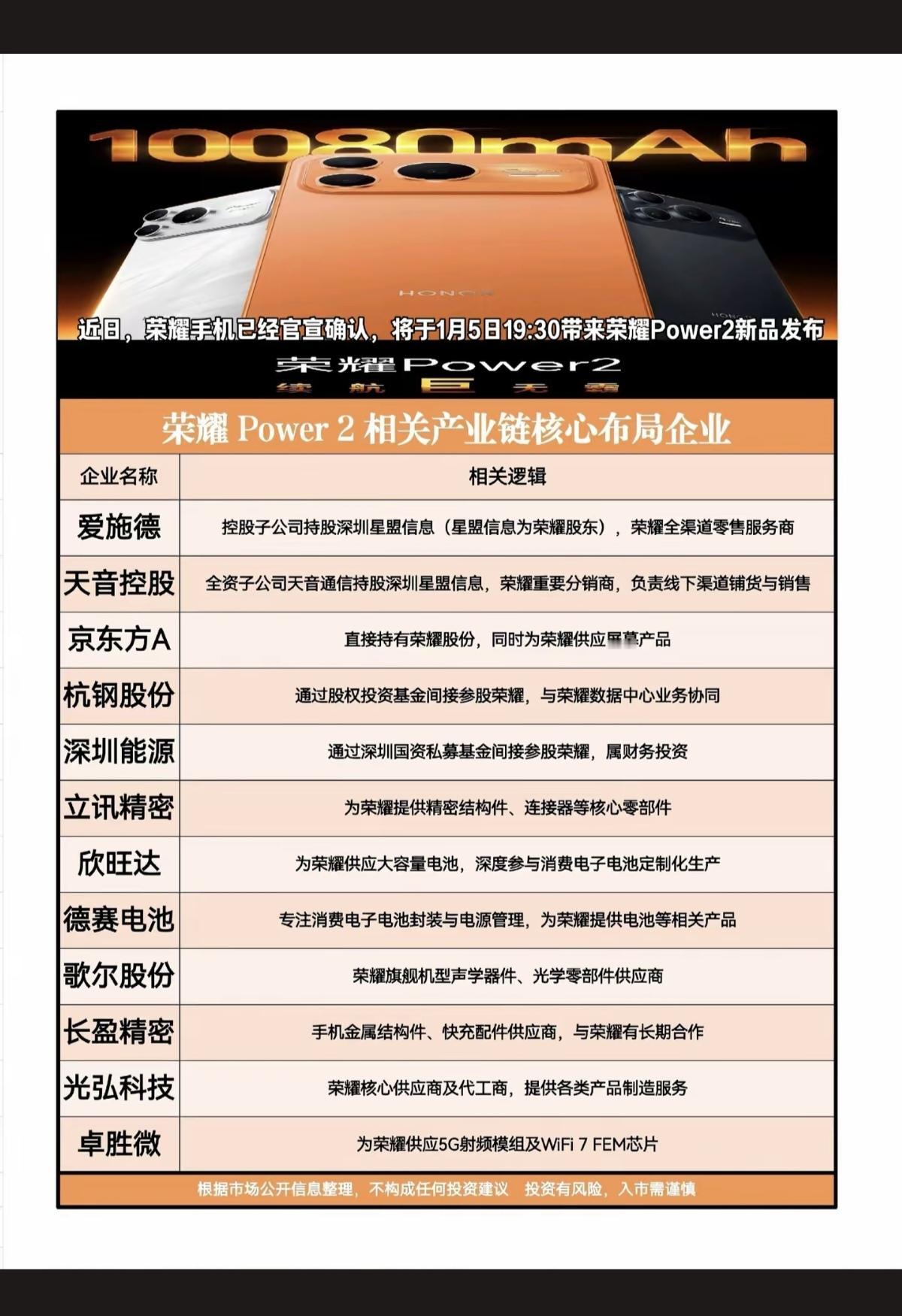 荣耀Power2相关产业链布局企业! 近日,荣耀官宣,将于1月5日带来荣耀Power2新品发布。 相关核心龙头股:
