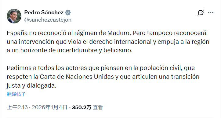 西班牙首相桑切斯:西班牙不会承认美国对委内瑞拉的干预,因为违反国际法