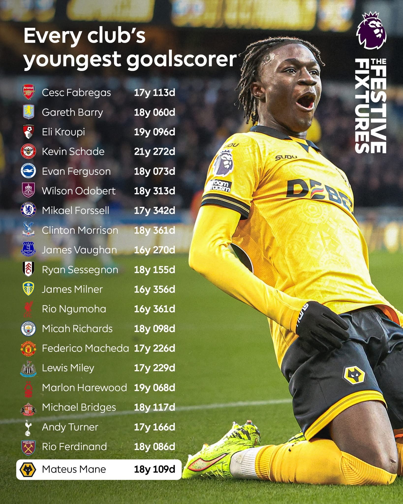 麥真恩第一次喺英超梅開二度;屈堅斯自從2023年4月之後,第一次喺禁區外取得英超入波;維拉近13場各項賽事贏12場 ,今季主場連勝去到8場,同曼城並列20隊之冠。森林近6場英超輸咗5場,球隊進攻嘅諗法同理念認真要調節下,龍門莊域陀(John Victor)嘅決定都幾攞命。鍾柔美(中遊尾)嘅白禮頓大戰夏柔美(下遊尾)嘅般尼,白禮頓近7戰首勝,但係焦點就落喺70分鐘後備上陣,現年40歲嘅老將詹士米拿身上,自2002年以來已經喺英超聯擁有25年職業生涯紀錄。狼隊總算取得球季第一勝,亦都係第一次保持清白之軀。年輕球員馬迪奧斯文尼(Mateus Mane)相當搶鏡,先係締造十二碼由黃喜燦射入,再有自己喺41分鐘射入成3-0。今仗佢哋嘅左路威脅相當大,若非艾利奧拿把關出色,韋斯咸未必淨輸三粒。阿仙奴都有迪勤萊斯梅開二度,今季貢獻咗4個入波7次助攻。先失一波嘅佢哋由將功補過嘅加比爾後上射入追和,麥杜基嘅決斷同突破好關鍵。般尼茅夫表現唔差,亦都有唔少威脅埋門。伊雲尼路臣(Francisco Evanilson)捕捉住加比爾失誤射入取得領先;卻比(Eli Kroupi)下半場後備入替第一腳觸球就命射得手,可惜為時已晚。英超第20週賽事賽果-阿士東維拉3-1 諾定咸森林白禮頓2-0 般尼狼隊3-0 韋斯咸般尼茅夫2-3 阿仙奴列斯聯🆚曼聯(稍後時間進行)紐卡素🆚水晶宮托定咸熱刺🆚辛德蘭愛華頓🆚賓福特富咸🆚利物浦曼城🆚車路士 🏴