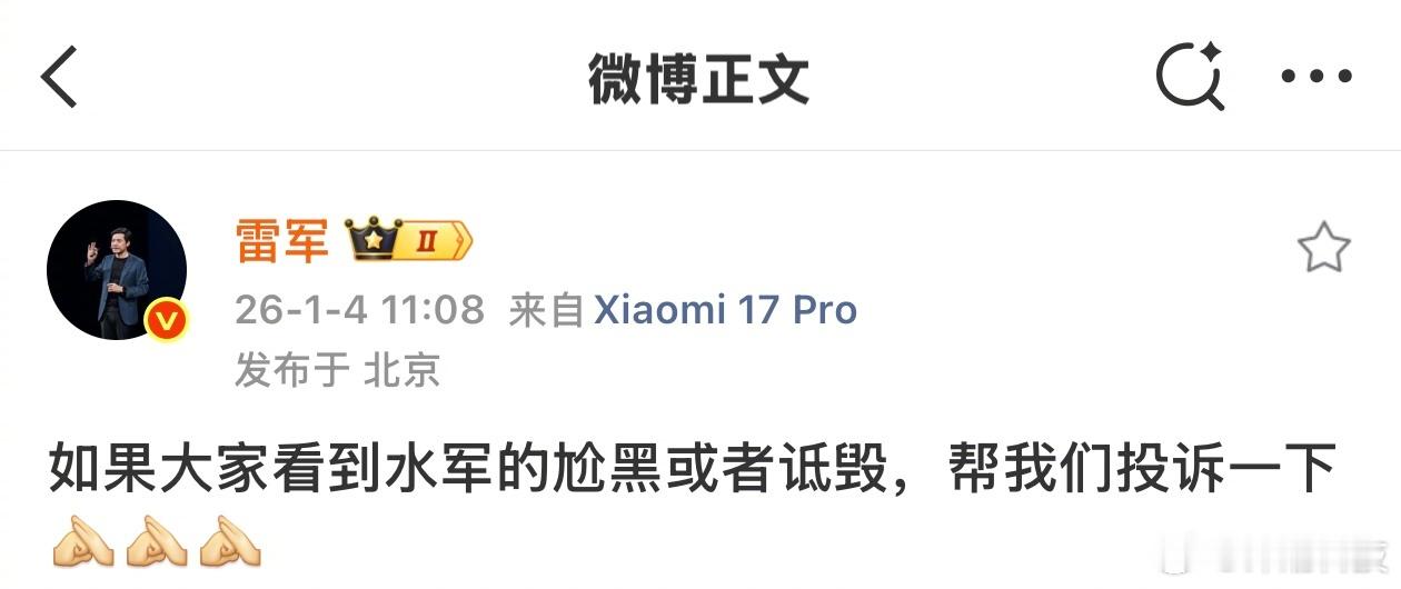 雷军:如果大家看到水军的尬黑或者诋毁,帮我们投诉一下。