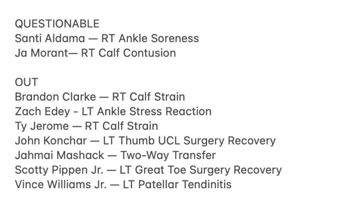 湖人明日10点30对阵灰熊,ESPN给出获胜概率:灰熊34.8%、湖人65.2%。八村塁(右小腿拉伤)、里夫斯(左小腿拉伤)、蒂耶罗(右膝内侧副韧带扭伤)、文森特(腰椎背部拉伤)缺阵。阿尔达马(右踝酸痛)、莫兰特(右小腿挫伤)出战成疑;克拉克(右小腿拉伤)、伊迪(左踝应力性反应)杰罗姆(右小腿拉伤)、康查尔(左手拇指尺侧副韧带手术后恢复中)、马沙克(双向合同)、小皮蓬(左脚大脚趾手术后恢复中)、威廉姆斯(左膝髌腱炎)缺阵。当前指数,湖人主场-6.5。灰熊vs湖人