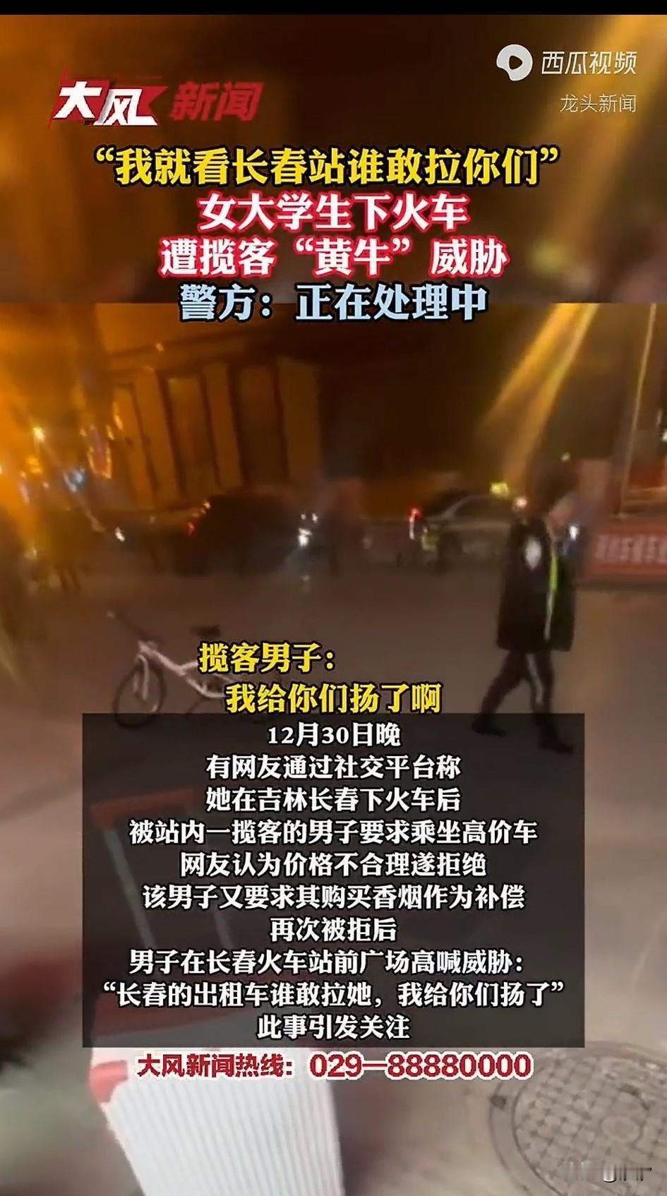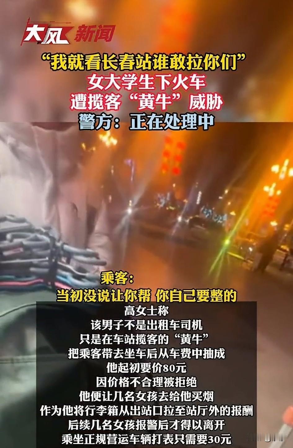 长春文旅天塌了, 本来好好的营造吉林旅游强省, 结果社会威哥横空出世, 直接在长春火车站广场非法揽客, 欺负三名女大学生, 这事闹得全网皆知, 这是发生在2025年的12月30号22点, 在长春火车站非法揽客, 看见三名女生拉有行李, 就热情上前攀谈, 通过哄骗的方式拉着女生的行李, 将三人诱骗至出租车跟前, 居然提出了80元天价车费, 明明打表只需要30块钱, 女生们知道被坑之后, 表示拒绝乘坐, 这可把费尽心机的张某给惹怒了, 煮熟的鸭子马上要飞了, 他就开始大声吵嚷着, 今天我看谁敢拉她们, 谁拉她们我就把谁扬了, 想以此逼迫三位女生就范, 三位女生眼看情况不对, 就一直解释我们没有让你帮忙, 现在我们不想坐车了, 没想到张某又换了个油头, 他直接让女生给他买烟, 说自己帮忙拉了一段行李, 这就当做报酬了, 奈何三名女生不为所动, 其中一位女生赶紧报警, 叔叔赶到后张某依旧嚣张, 看来是在当地嚣张惯了, 说话依然非常很辣, 充满了威胁的意味儿, 这简直就是给吉林长春人抹黑, 谁能想到将南方游客宠上天的长春居然还存在着这样的可怕事情! 事后女生将遭遇发上网络, 瞬间引起了网友的关注, 当地已经出了后续, 那就是直接将人给拘留了, 大家对于长春张茂在火车站非法揽客这事怎么看? 长春火车站宰客 长春车站事件 长春市旅游 来长春旅游
