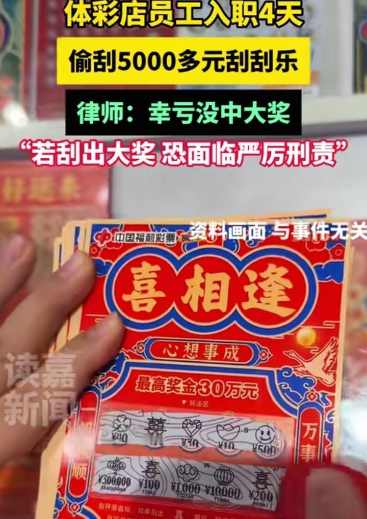 偷刮5000元刮刮乐都没中大奖,这种人运气太背,真不适合做彩票店店员。 近期江苏淮安一位刚入职4天的彩票店店员火了,他趁老板不注意,偷刮了5000多块钱的刮刮乐,结果没中大奖,被老板发现后报了警。 最后老板心地善良,让该店员赔了彩票钱私了。 有律师表示幸亏没中大奖,要不然恐怕面临严重刑责。 我也想说,幸亏没中大奖,如果中了,在老板发现以前,店员把彩票钱一付,转身离职去兑奖,岂不是如愿了? 刮了5000块都没中大奖,这个运气也太背了,身为彩票店员,想空手套白狼,想中奖想疯了,这说明没有克制力的人还真干不了这行。