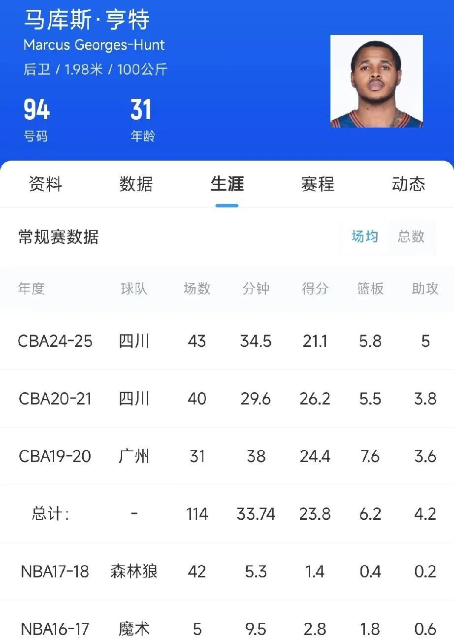 第五外援来了!辽宁男篮或将签下亨特! 辽宁男篮近期战绩不尽如人意,一波四连败后战绩来到了4胜5负,从排名来看已经到了第13名,这也是这几个赛季的最差排名! 据悉,辽宁男篮正在考虑签下上赛季效力于四川的外援亨特! 亨特,身高1.98米,司职后卫,上赛季在四川场均21.1分5.8篮板5助攻的数据。还曾效力于NBA森林狼和魔术,今年才31岁,正值当打之年! 如果能顺利签下,那么布朗大概率要走人!