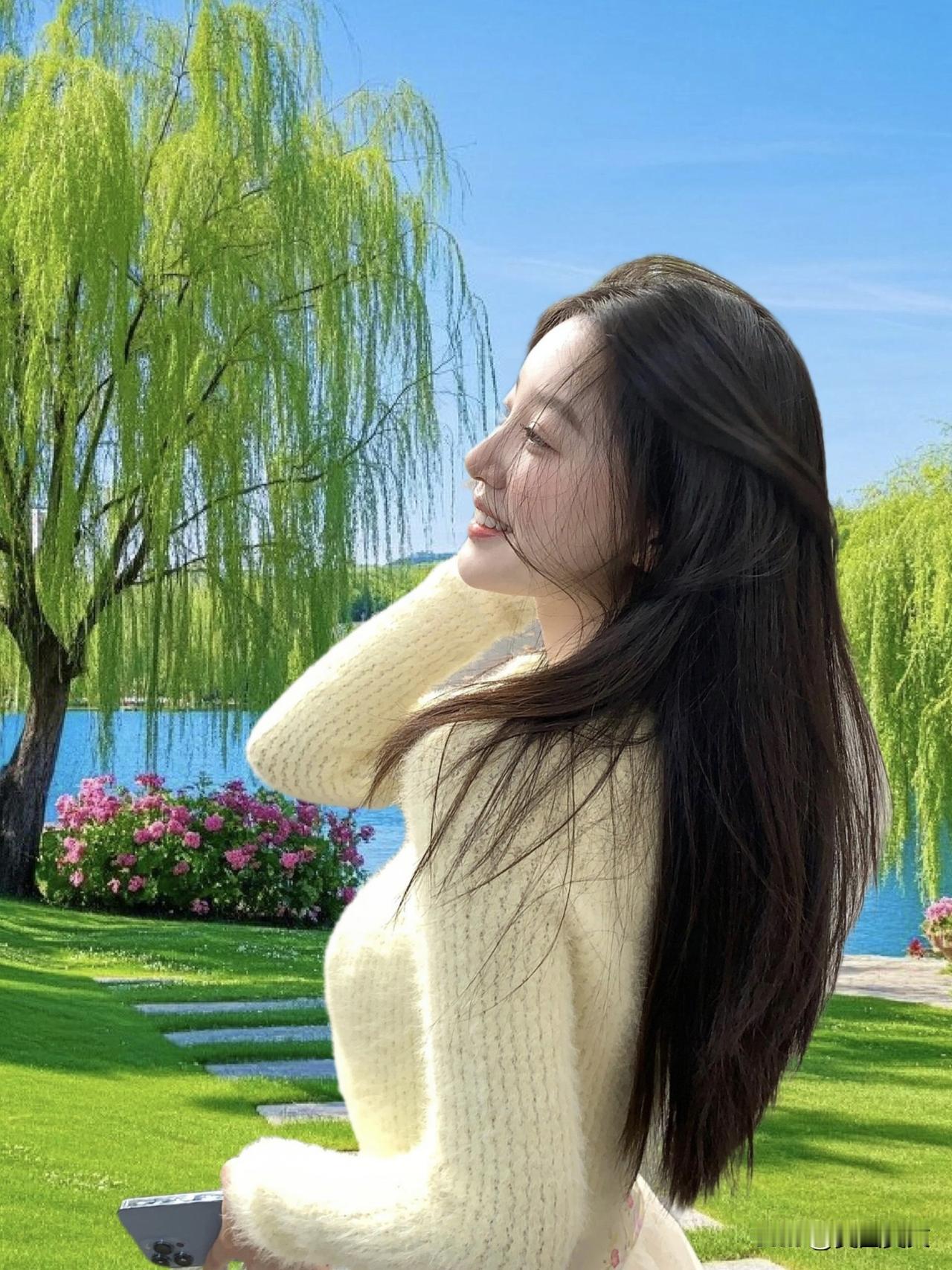 阳光明媚的午后,少女在湖畔微笑,享受美好时光。