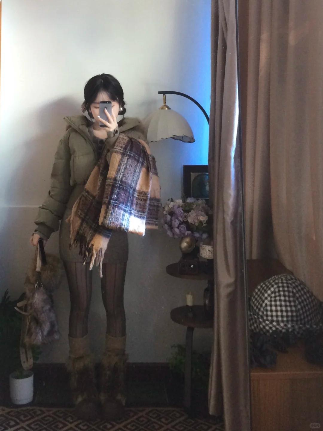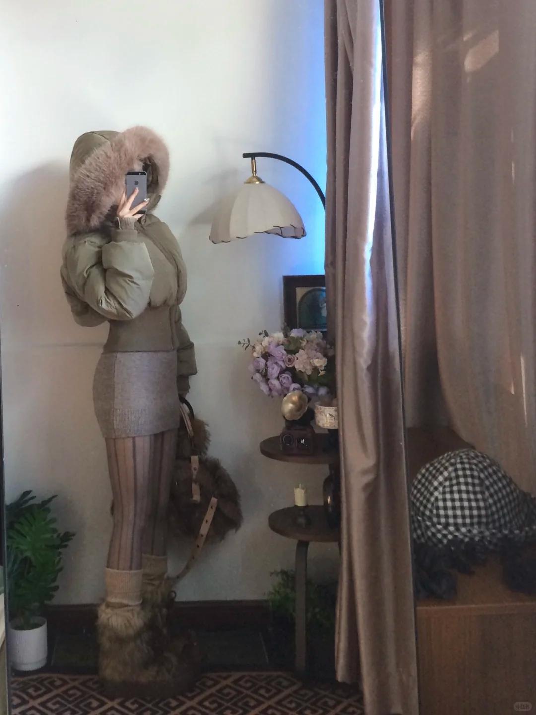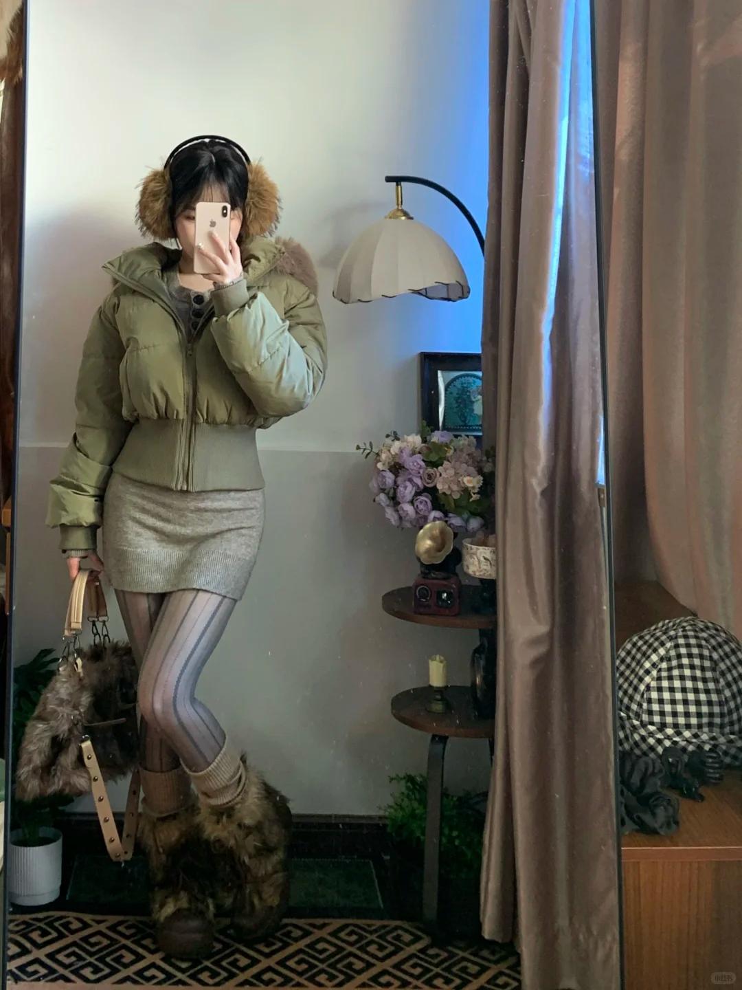 收腰款超短羽绒服对小个子女生真的太友好了~ 军绿色收腰款超短羽绒服搭配灰色针织包臀短裙,丝袜+长筒靴,打造属于小个子的冬季短+短的穿搭,不仅明示高腰线,凸显身材完美三七分,更能打造大长腿,整体穿搭遮肉显瘦显高显腿长,又不失性感小心机,相信没有哪个小个子女生能抵抗这样的冬季穿搭! 图片来源于博主:菲菲猪