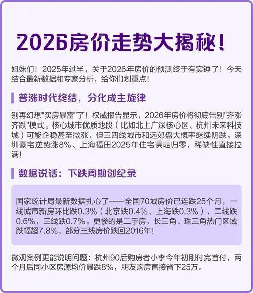 2026年房价会不会涨?多家专业机构的答案很明确:全国不会普涨,整体会止跌回稳,不同城市、不同房子的差别会特别大。 新房市场的销售面积预计会跌5%-6%,价格基本稳住或微微下降;二手房成交量能涨5%-7%,但价格还是有点往下走的压力。 一线和核心二线城市,比如北京、上海、杭州这些地方,有人口和产业撑着,买房的需求一直有,新房价格可能微涨0.5%-1%,核心地段的好房子更有看头。反观多数三四线城市,房子库存多,人口吸引力弱,去库存是大难题,房价大概率还得降。 影响房价的关键有三点:一是库存能不能顺利卖掉,供求关系才会好转;二是大家对收入、就业的信心足不足,敢不敢买房;三是政策给力不给力,比如会不会放宽限购、降低房贷利率。 最后给大家提个醒:买房先看城市,全国行情参考意义不大;优先选设计好、配套全的好房子,抗跌又保值。自住的话不用等抄底,遇到合适的就可以下手;投资的话一定要谨慎,只看一线和强二线核心地段的房子,做好长期持有的准备。