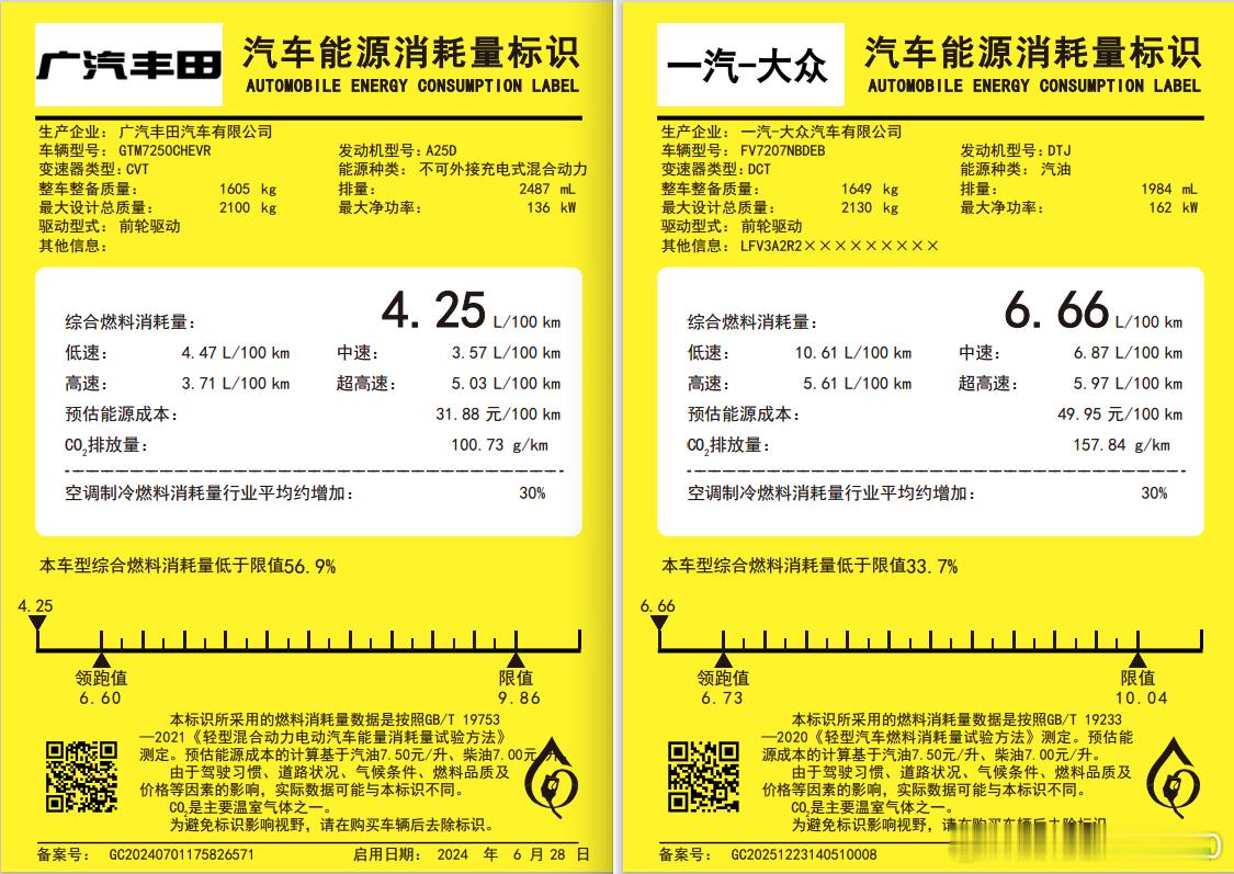 有人说高速上面混动不省油,你告诉我,工信部是骗我了吗?黄色标贴上的超高速段油耗,谁更低? 左:2.5L混动凯美瑞右:2.0T+DSG迈腾迈腾2.0T EA888发动机配合DSG变速箱被大家称作高速油耗最低的B级车,实际上比2.5L的自吸油混凯美瑞在wltc超高速段的油耗更高一些。只是优势没有低速那么大而已