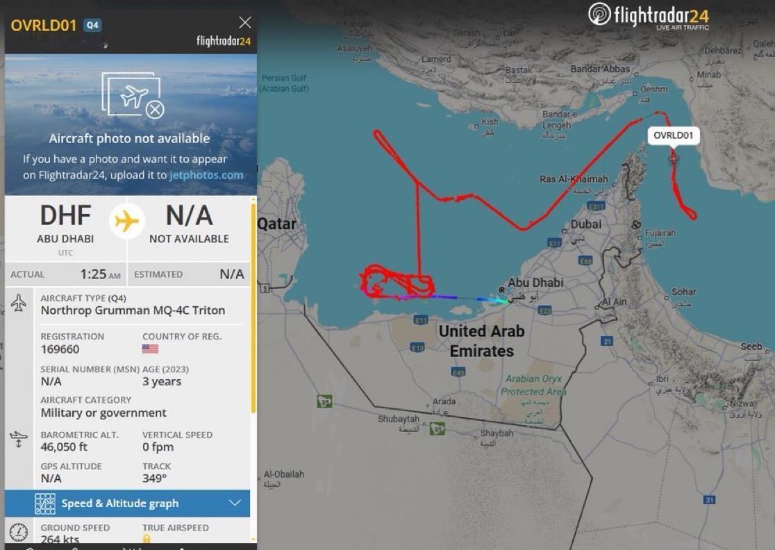 美国海军连续第三天使用第四架飞机对霍尔木兹海峡进行不间断监视。 这架 MQ-4C Triton(注册号:169660)侦察无人机在两架 P-8A Poseidon 海上巡逻侦察机之间飞行后再次起飞。