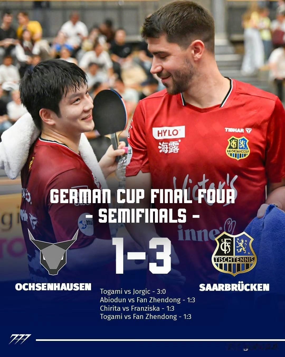 2025/2026赛季乒乓球🏓 德国杯半决赛:1.4 18:00 【萨尔布吕肯3-1奥克森豪森】 第一盘:达科·约奇克0-3户上隼辅(9-11、9-11、1-11) 第二盘:樊振东3比1阿比奥顿 (11-5、11-9、11-13、11-5) 第三盘:帕特里克·弗朗西斯卡3-1奇里塔(6-11、11-8、11-8、11-4) 第四盘:樊振东3-1户上隼辅(10-12、11-8、11-6、11-5) 恭喜萨尔布吕肯进决赛! 决赛将对阵霍姆堡与富尔达马伯策尔之间的胜者!【P5】