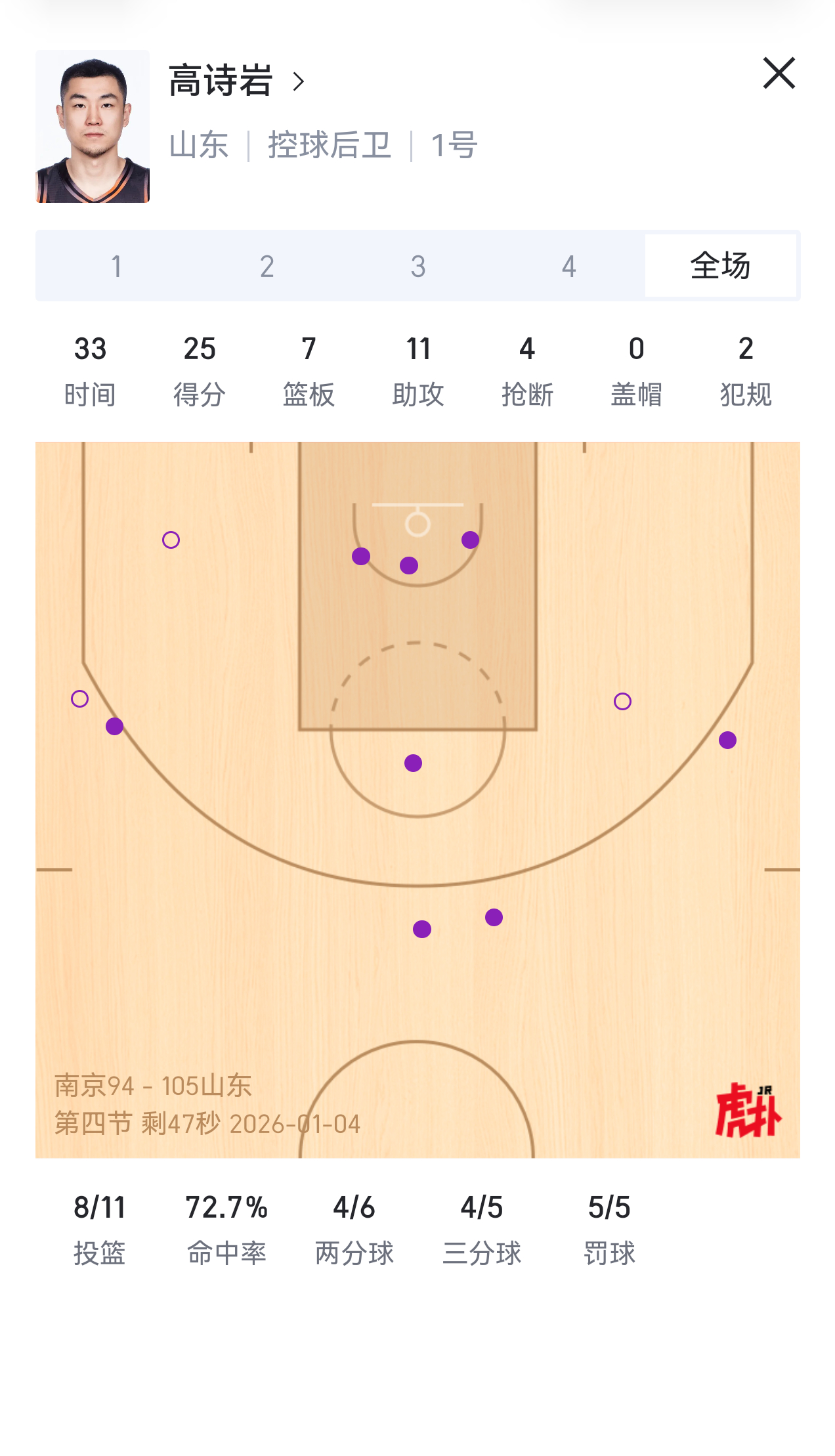 高诗岩今天打的不错,25分7篮板11助攻,命中率72%,这一场估计能把自信心找回