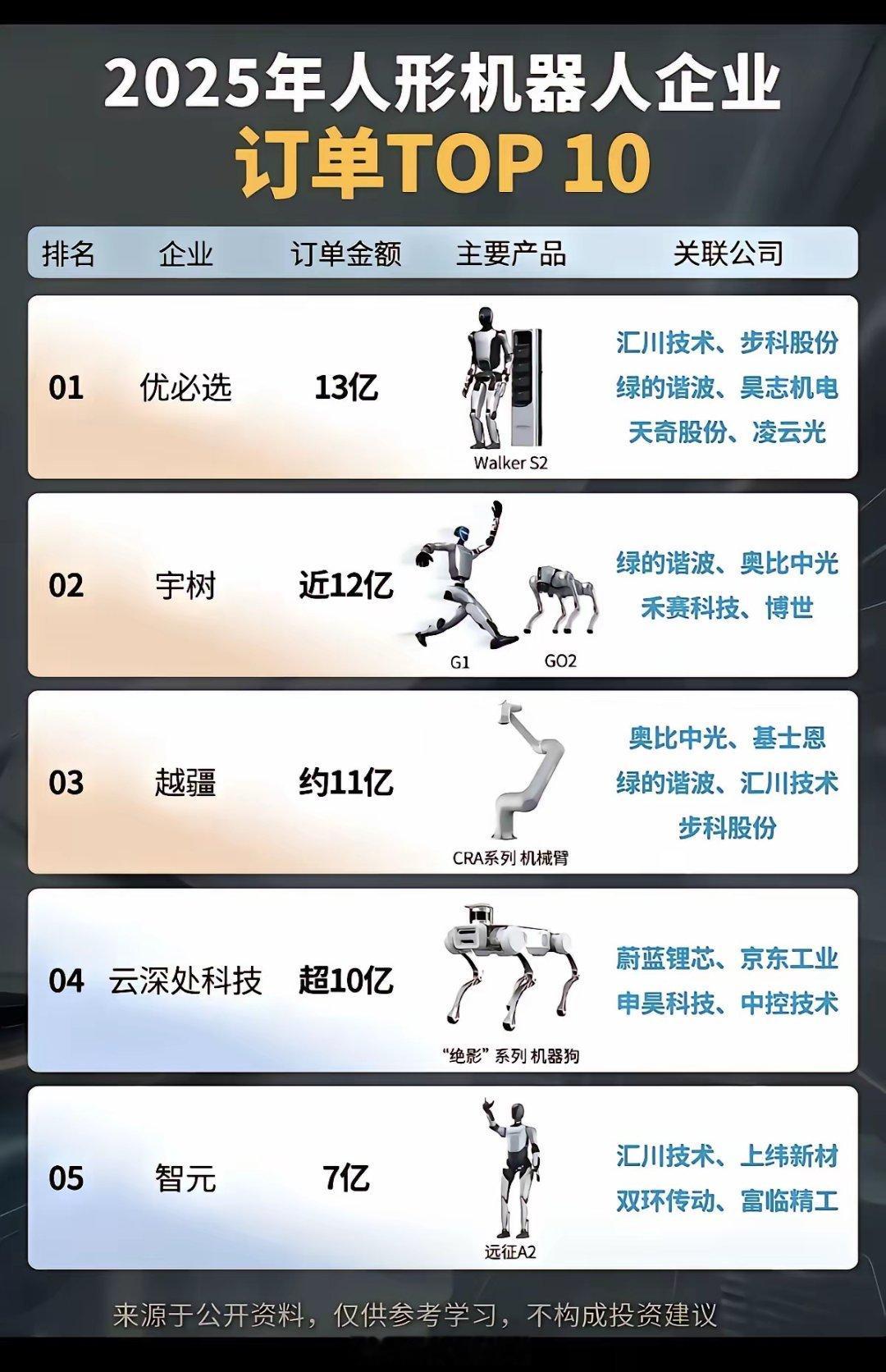 2025年人形机器人:企业订单TOP10!订单排名:第一名:优必选第二名:宇树科技第三名:越疆-