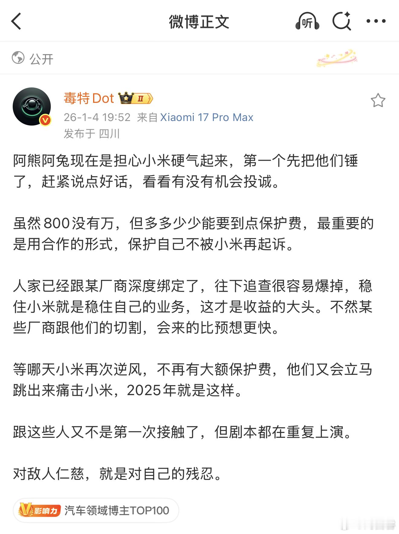 之后,我一整天陆续翻了各个热搜、切片和评论,也看到了某几位博主扮演理中客的发言其实从这次直播,和直播后半段让大家看爽的几条回应,包括后续的影响,看完后 我冷静下来想了很多站在米粉视角,我确实希望小米只找真心实意热爱小米的博主合作,如果不是米粉 也可以是行业内真正有影响力 称得上优质创作者的博主,而不能找那些只会靠调动情绪挑起对立 但缺少高价值内容的博主、更何况是对小米没有感情的墙头草但站在博主视角,我知道大企业做出任何决定背后都必定有复杂的原因,更何况小米从去年以来持续处在风口浪尖,不夸张地说 任何决策都会是双刃剑,压根就不存在完美方案,所以我也尊重小米的决定我作为小博主,能做的就是努力点,多发微博,还需要走出舒适区 多做视频,最后就是增强内容时效性不说了,我要一口气睡到天亮,然后再一口气工作一整天!