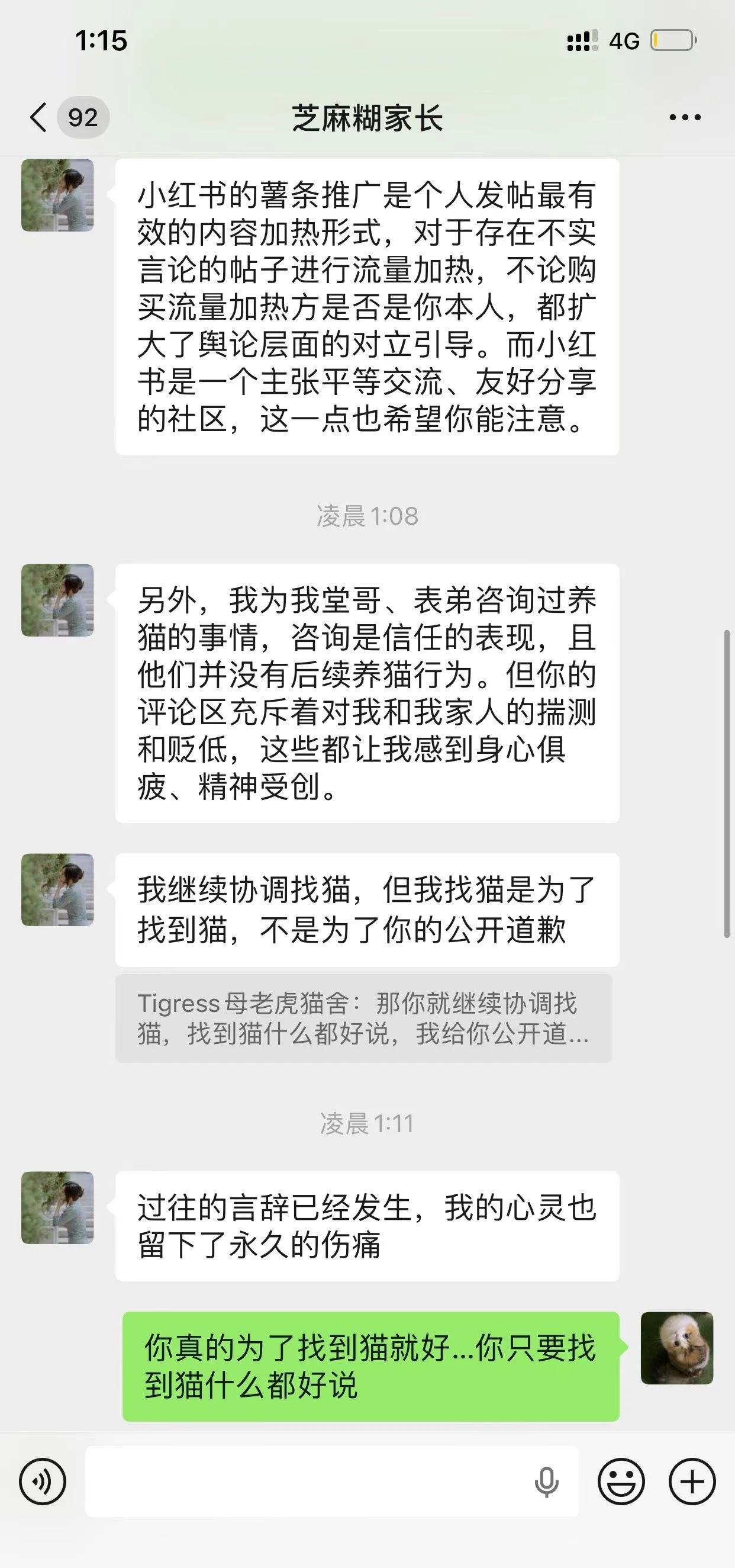 芝麻糊事件今晚的进展是:对方威胁🚔维权 俺可能也需要法律援助[流泪] 在我再三澄清我不是为了网暴她,只是为了逼她出来找猫后,对方发言如图2️⃣。 不肯对我透露丢猫的地址,说属于家人隐私。 目前多亏各位热心网友帮忙,非常感谢感动🥹正是因为大家的关注对方才迫于舆论出现回复消息,起码算表态会继续找了。 蹲一个后续 有时候真的很无助 社区公约