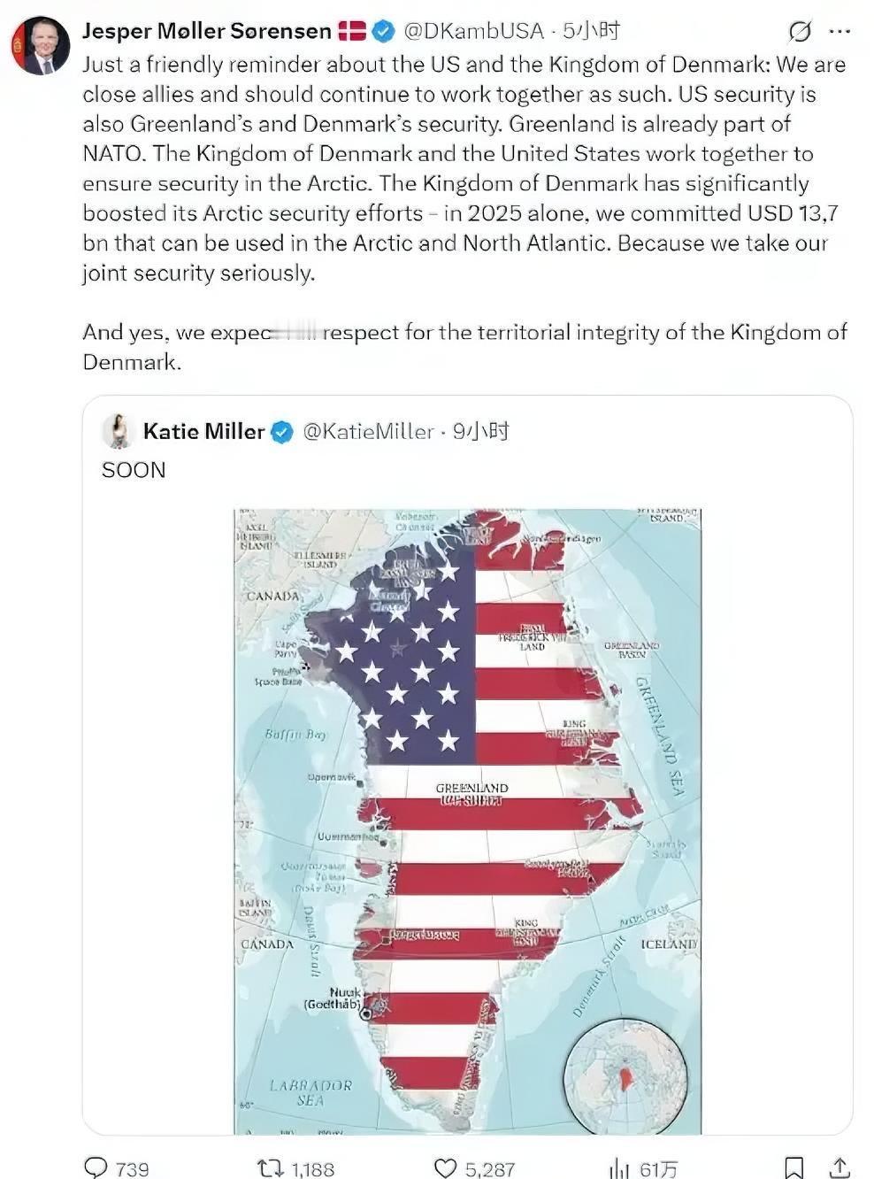 马杜罗被抓后,最着急的会是谁?不是古巴,不是哥伦比亚,而是丹麦!1月3日,特朗普核心幕僚斯蒂芬·米勒的妻子、保守派网红凯蒂·米勒在社交媒体发了一张图,把丹麦人吓坏了!丹麦驻美国大使索伦森迅速转发这张图并长篇配文,那字里行间充斥着一种“焦急的哀求”:都是兄弟姐妹,有事好商量!格陵兰岛,真的“快了”吗?那再再下一个,又会是谁?这世界,真的要进入“新殖民时代”吗?美国人,谁能管管他们?