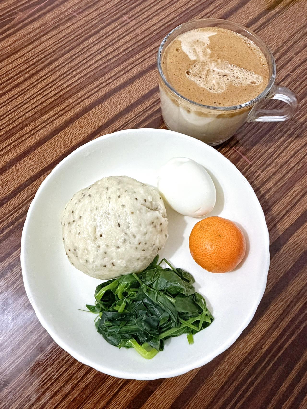 还债第一天体重:108.5斤,比昨天体重少1.1斤 今日减脂早餐:山药馒头+鸡蛋+青菜+橘子+拿铁