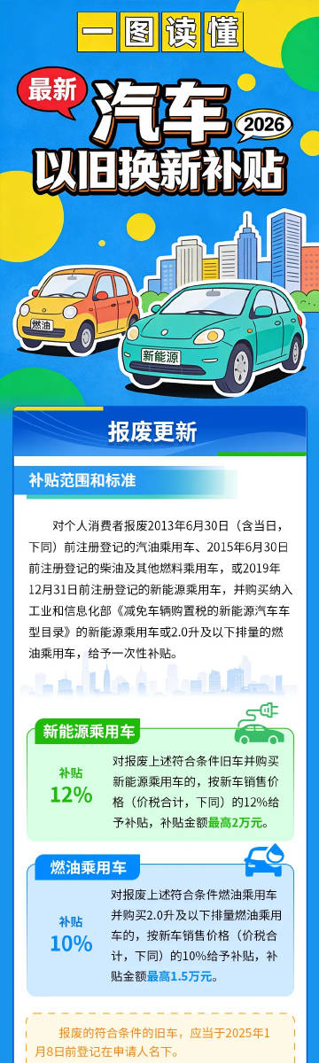 【一图读懂|2026年汽车以旧换新补贴】对个人消费者报废2013年6月30日(含当日,下同)前注册登记的汽油乘用车、2015年6月30日前注册登记的柴油及其他燃料乘用车,或2019年12月31日前注册登记的新能源乘用车,并购买纳入工业和信息化部《减免车辆购置税的新能源汽车车型目录》的新能源乘用车或2.0升及以 ...全文