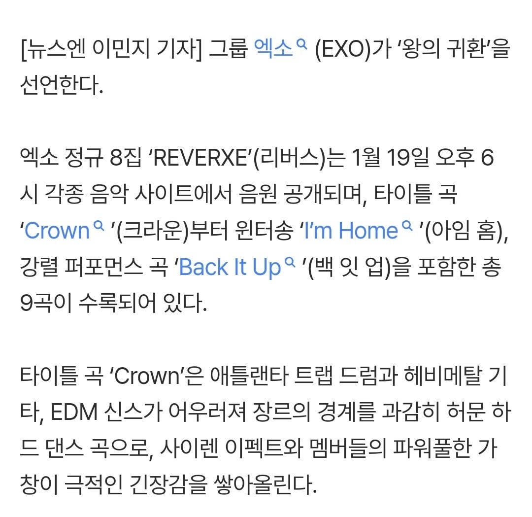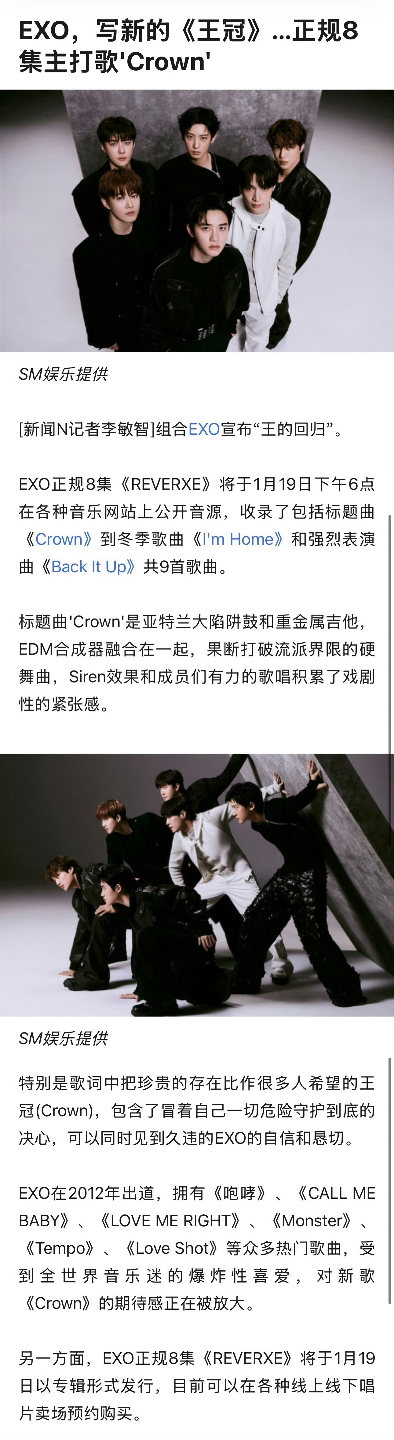 EXO正规8辑收录9首歌曲 EXO正规8辑《REVERXE》(Reverse)将于1月19日下午6时在各大音乐网站公开音源,专辑收录了主打曲《Crown》、冬日歌曲《I'm Home》、强烈表演曲《Back It Up》等共9首歌曲。