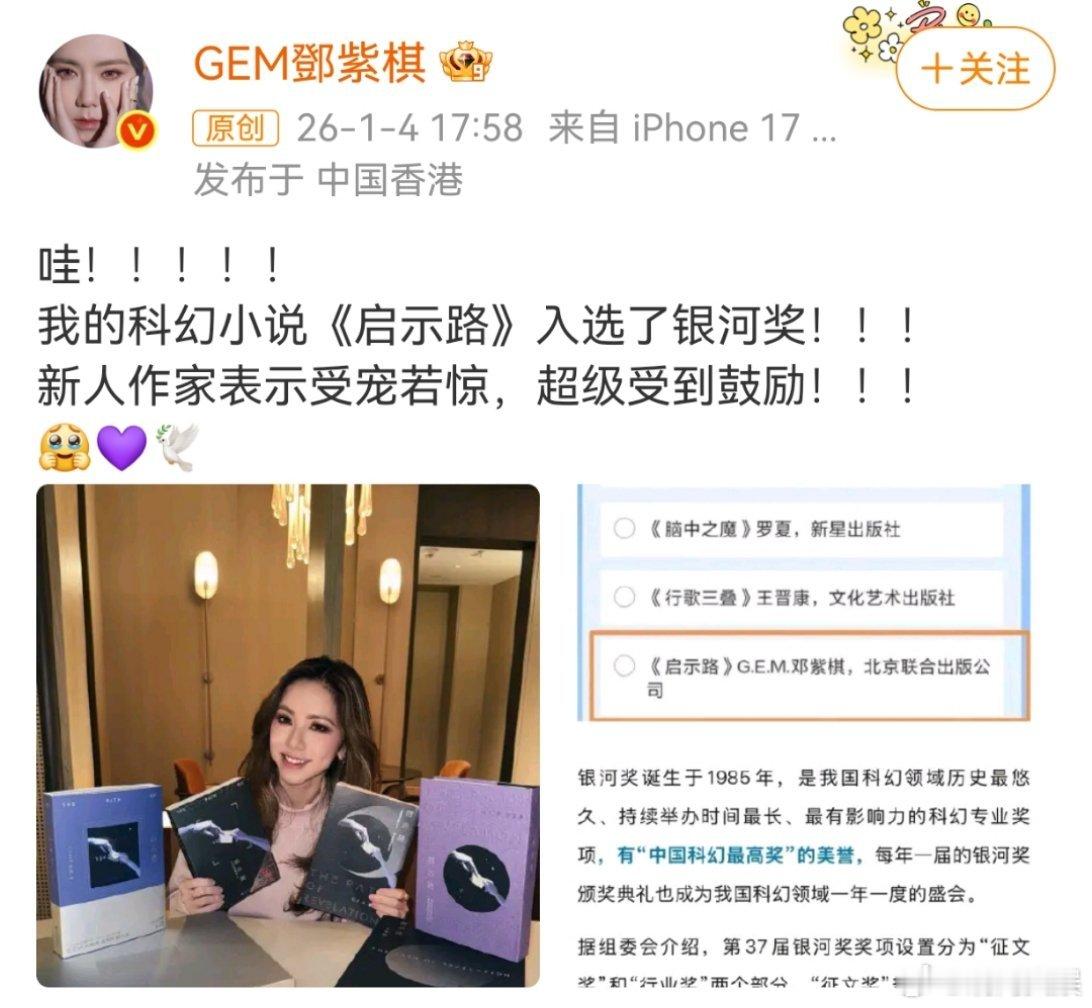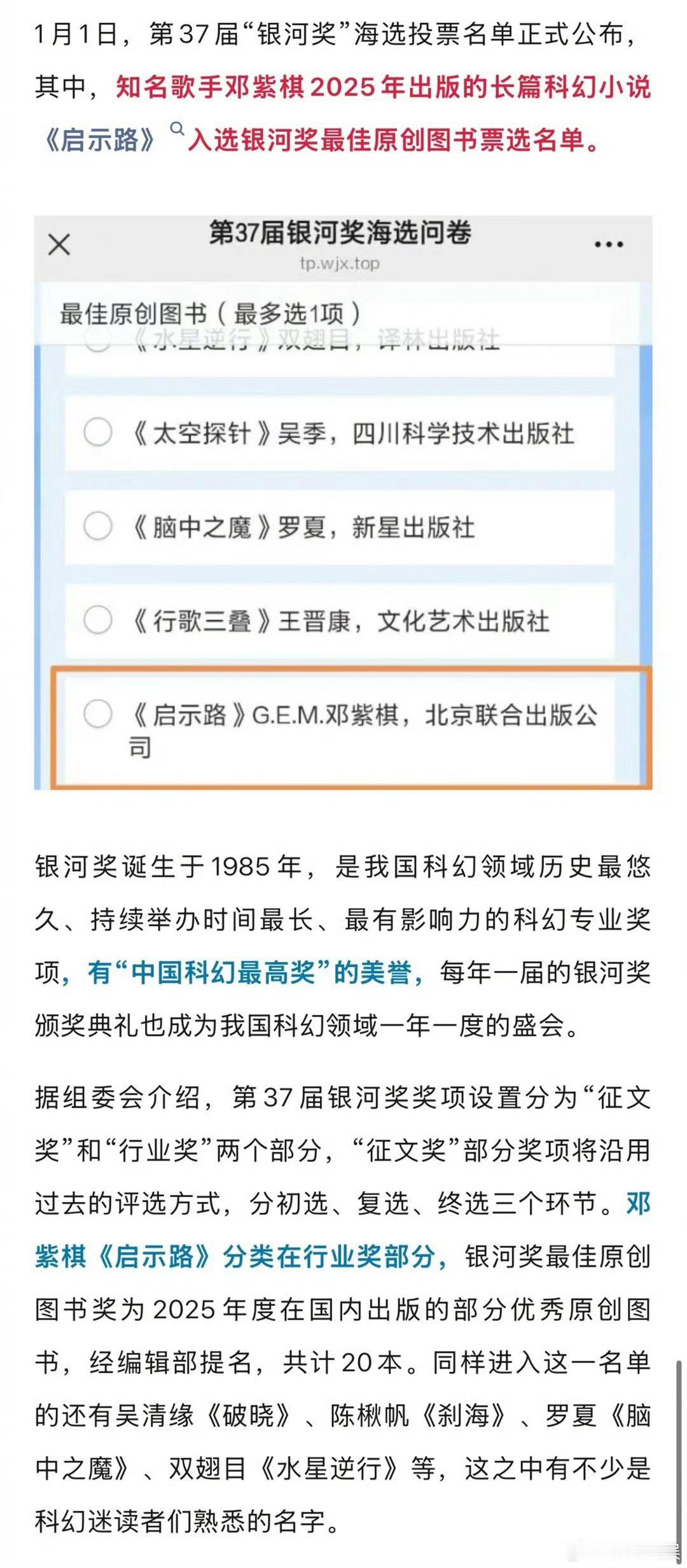 银河奖组委会回应邓紫棋小说入选组委会称解释邓紫棋小说并非入围日前,宣布自己所著小说《启示路》入选了被称为“中国科幻最高奖”的“银河奖”,她称感到非常惊喜,也引发了热议。1月4日晚,银河奖组委会回应邓紫棋入选,称部分媒体对个别作品进入投票名单产生误读,同时也有读者对这一情况可能导致的种种问题提出了关切和质疑。组委会表示:1、当前阶段为银河奖的初选环节,进入本名单的作品并非“入围”,初选后的结果也只是“复选名单”而非“入围名单”;2、银河奖面向2025年度全国范围内出版的所有简体中文原创科幻图书,所有在该年度正式出版的此类科幻图书均可被提名;3、对投票规则进行优化调整,取消投票者须对每个选项进行投票的要求,投票者可根据个人意愿仅对部分奖项进行投票。