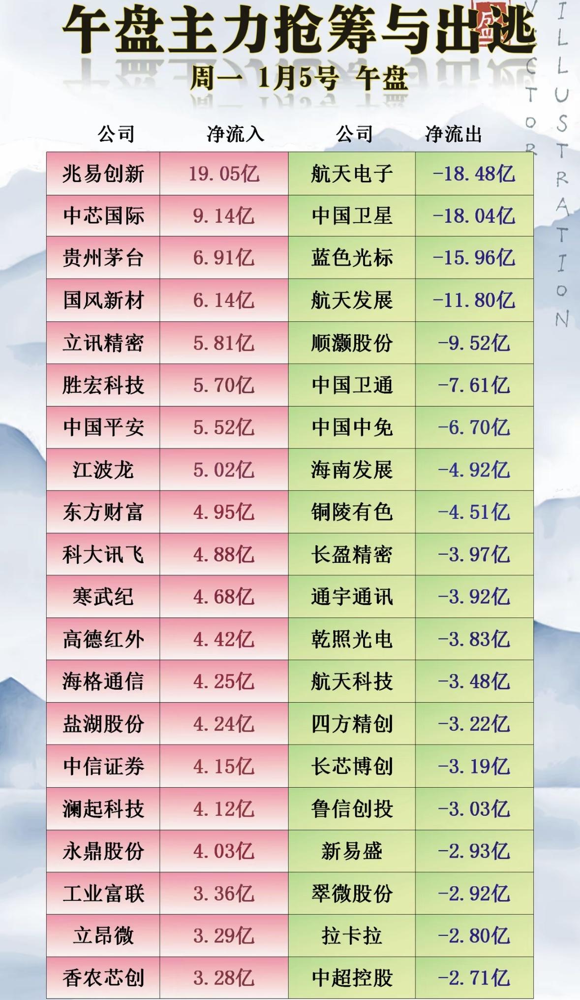1月5日午盘资金净流入前20名,投资需谨慎! 资金流入榜:兆易创新领跑,中芯国