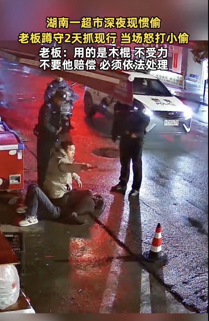 “太狠了,简直是往死里打?” 近日,湖南一超市老板深夜怒打小偷的视频引起了社会的关注,视频中凌晨三点多,一位男子藏在冰柜后面,手里拿着根一米多长的棍子,男子不断伸头观望超市门口的货柜,好像是在等待着什么。 男子是这家超市的老板,最近老板发现自家货柜等东西屡次被偷,于是就连续两天深夜蹲守,准备抓拿偷东西的窃贼。不久后,一位年轻的男子来到超市门口,环顾四周确认没有人后,开始盗窃货柜里的饮料等物品。 老板见状,悄悄起身绕到小偷背后,举起手中的长棍猛的向小偷的腿部打去,可能是木棍太长打到了地上,木棍断为两截。 老板见木棍断了,于是就用手里剩下的小半截木棍继续击打小偷的腿部,小偷显然是被这突如其来的一幕吓住了,转头惊恐的看着老板,老板此时显然是异常愤怒,用棍子疯狂的砸向小偷的腿部和头部。 小偷被打的毫无反抗之力,双手捂住头蹲在地上,最后超市老板把小偷打倒在地,跨坐在小偷身上,直到警察到来,老板依然没有起身。 看过视频后,有人说,小偷只是偷东西,没有对人造成威胁,这老板大人太狠了,应该被追责! 有人说,小偷肯定不对,但老板也不是好人,小偷偷你东西,你可以报警,但是不能打人,尤其是用棍子打的那么狠。 也有人说,看到小偷挨打那一刻,我心生怜悯了,也许孩子真是有困难,大家应该帮他一把。 事后,超市老板也出面澄清了这件事,老板说这个小偷是惯偷,来偷过很多次东西,当时抓小偷时他用的是木棍,不受力,老板还说不要小偷赔偿,必须依法处理。 对于这件事,我认为首先小偷偷东西肯定不对,不管什么原因都不能成为偷盗的借口,而且还不是偶尔偷一次,是屡次偷盗人家的东西,人家辛辛苦苦开店也不容易,所以偷东西被打活该,一点都不屈。 但是,这件事中超市老板做的也有点冲动,当时老板用棍子殴打小偷,尤其是数次用棍子击打头部,万一把人打坏了,或是失手打死了,那就麻烦了,本来是自己有理的事,结果却变成了没理的事了。 所以,遇到这种事情时,只要把小偷制服交给警察就行了,最好是不要打人,免得给自己惹上麻烦。