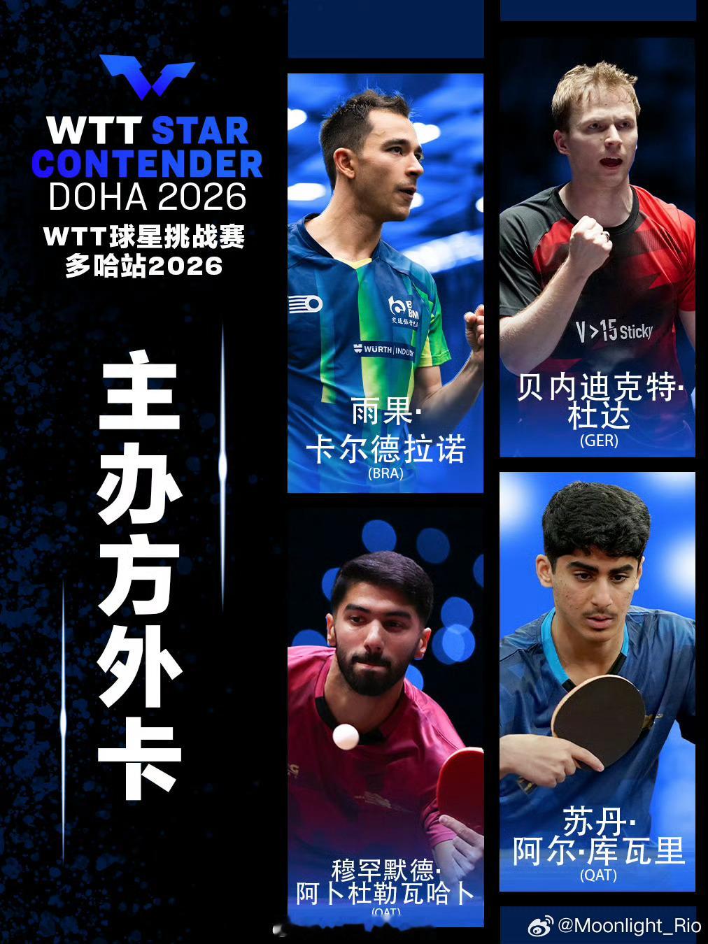 WTT球星挑战赛多哈站2026WTT提名名单:🇩🇰安德斯·林德、🇵🇷阿德里安娜·迪亚兹、🇫🇷西蒙·高茨、🇮🇳艾希卡·穆克吉WTT青少年提名:🇨🇳温瑞博、🇰🇷刘叡潾主办方外卡(男单):🇧🇷雨果·卡尔德拉诺、🇩🇪贝内迪克特·杜达、🇶🇦穆罕默德·阿卜杜勒瓦哈卜、🇶🇦苏丹·阿尔·库瓦里主办方外卡(女单):🇸🇰塔蒂娜·库库洛娃、🇶🇦艾拉·穆罕默德、(AIN)伊丽莎白·阿布拉米安、🇶🇦罗卡娅·埃尔巴兹
