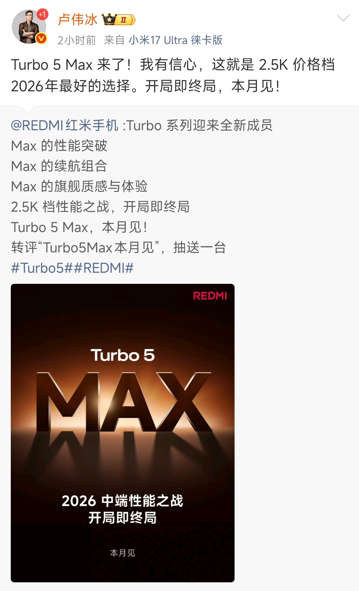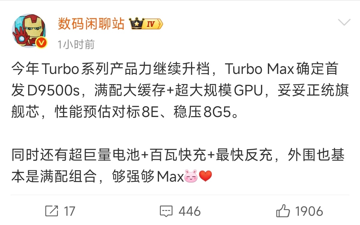 REDMI Turbo 5 MAX 官宣,感觉如何?「MAX」这个名字已经很明显了,非常典型的大屏机,搭配超巨量电池+百瓦快充+最快反充+满配外围,有点原来 K 系列那意思了嗷(这个 MAX 的倒影居然是 WIN,乐