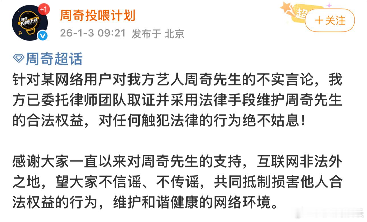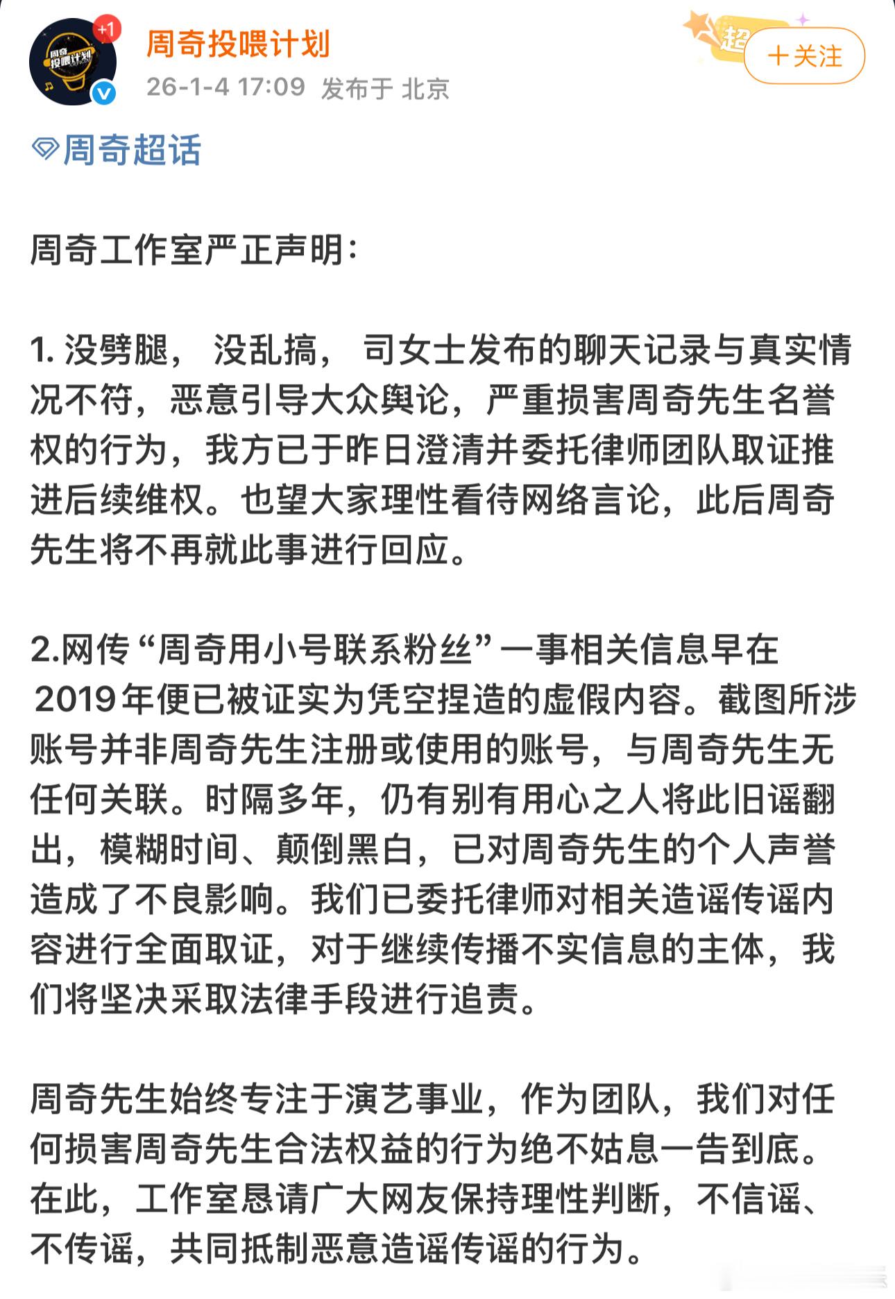 周奇时间线周奇向涵之 分手 2025年12月17日,有狗仔拍到出门后不久后,拖着行李来到他家。18日活动结束后,二人和朋友聚会到凌晨又一并乘车返回家中,在单元门口突然拥抱,疑似恋情曝光。随后,站姐“CuppyCake·周奇”发布聊天记录截图,称周奇2019年录制期间通过微博小号主动联系她,多次提供私人行程及航班号并要求组织粉丝接机。截图中包含“机场你安排人了吗”等明确要求,甚至因未见接机粉丝而追问安排。站姐表示自己曾劝阻此类行为,但周奇短暂收敛后又开始主动联系。2026年1月3日凌晨,微博用户(本名司晓迪)在其个人账号中发文喊话周奇,称自己“需要一个合理的解释”。2026年1月3日上午9:21,周奇工作室首次发布声明回应,指认爆料为不实言论,已委托律师团队取证,但声明中并未提及与向涵之的恋情传闻。2026年1月4日14:51,司晓迪再次发文,晒出其与周奇的聊天记录,显示周奇12月19日仍与其商议见面,并质问“你和xhz在一起你干嘛还要找我”,疑似暗示恋爱时间线重叠。同时,有网友指出周奇和司晓迪使用的头像疑似为情侣头像。当日下午17:09,周奇工作室再次发布声明回应称“没劈腿,没乱搞”,否认与司晓迪的不实传闻。同时,针对网传“周奇用小号联系粉丝”一事,工作室称相关信息早在2019年便已被证实为虚假内容。对于与向涵之的恋情传闻,周奇方仍未明确回应。2026年1月5日10:35,向涵之的经纪公司“鲜花盛开影业”转发其微博并配文“单身,在赶工”,否认其恋情争议。