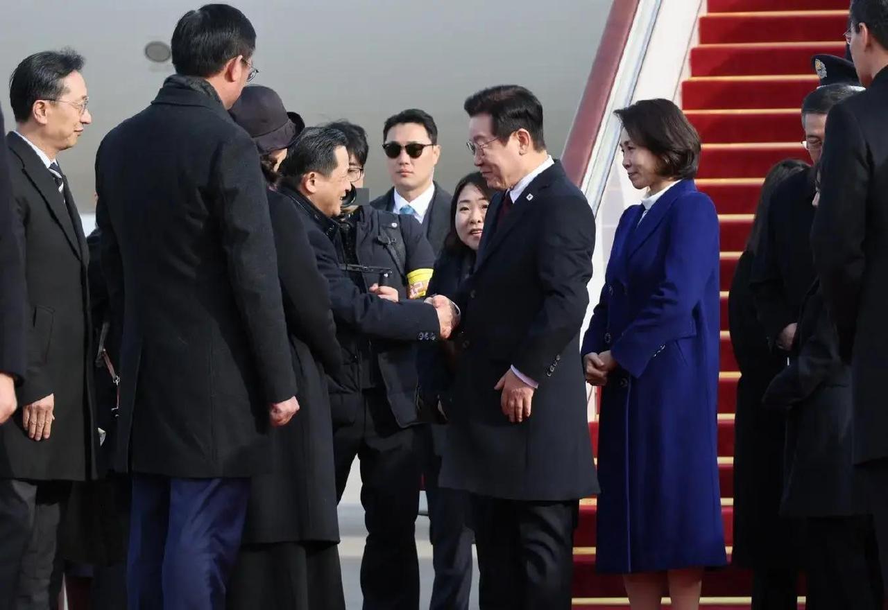 韩国新任总统首次访华,细节里能看出多少门道? 1月4日,62岁的李在明和夫人金惠景,从首尔飞抵北京,展开4天访问;这种在新年伊始安排的行程,本身就带着“重启合作”的信号。 在首都机场,李在明穿深色大衣配红色领带,这种配色,在东亚文化语境里,很容易被解读为对中国节庆氛围的呼应;类似的“颜色外交”,此前部分欧洲领导人来华时也用过。 59岁的金惠景选择宝蓝色长大衣、白衬衫和细高跟,整体比较利落,在零下气温下仍保持轻薄穿着,更多像是向媒体镜头展示形象管理,而不是以保暖优先。 她在接花环节主动蹲下,与中国小朋友视线齐平,这一幕被镜头放大后,容易被两国舆论当作“亲和”象征,也为后续民间交流营造了比较柔和的基调。 有中国网友把这一幕和其他地区领导人来华画面对比,感慨接机仪式上中方士兵队列整齐、神情冷静,认为“安全感”和“文明礼”是同时传递出去的两层信号。 从节奏看,这次访问更可能围绕经贸合作、供应链稳定、半岛局势等话题展开,但具体成果,还要看双方在安全关切、对外政策压力之间,能腾出多大妥协空间。 你更关心的是这次访问能不能带来实际合作,还是这些象征性的礼仪动作,会不会改变两国民意的彼此观感?