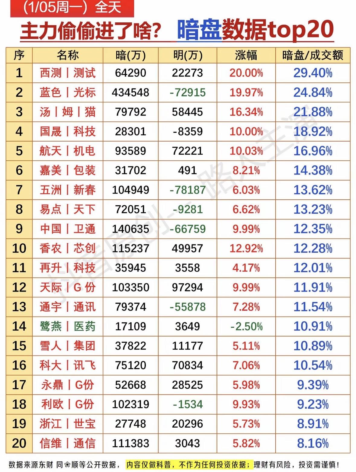 揭秘主力偷偷进场的秘密! 暗盘涨幅榜揭秘!主力暗中布局这些股,理财需谨慎哦~ 暗盘涨幅榜:西测测试领涨,汤姆猫、国晟科技跟涨,主力动向引关注。投资需谨慎,数据仅供参考。