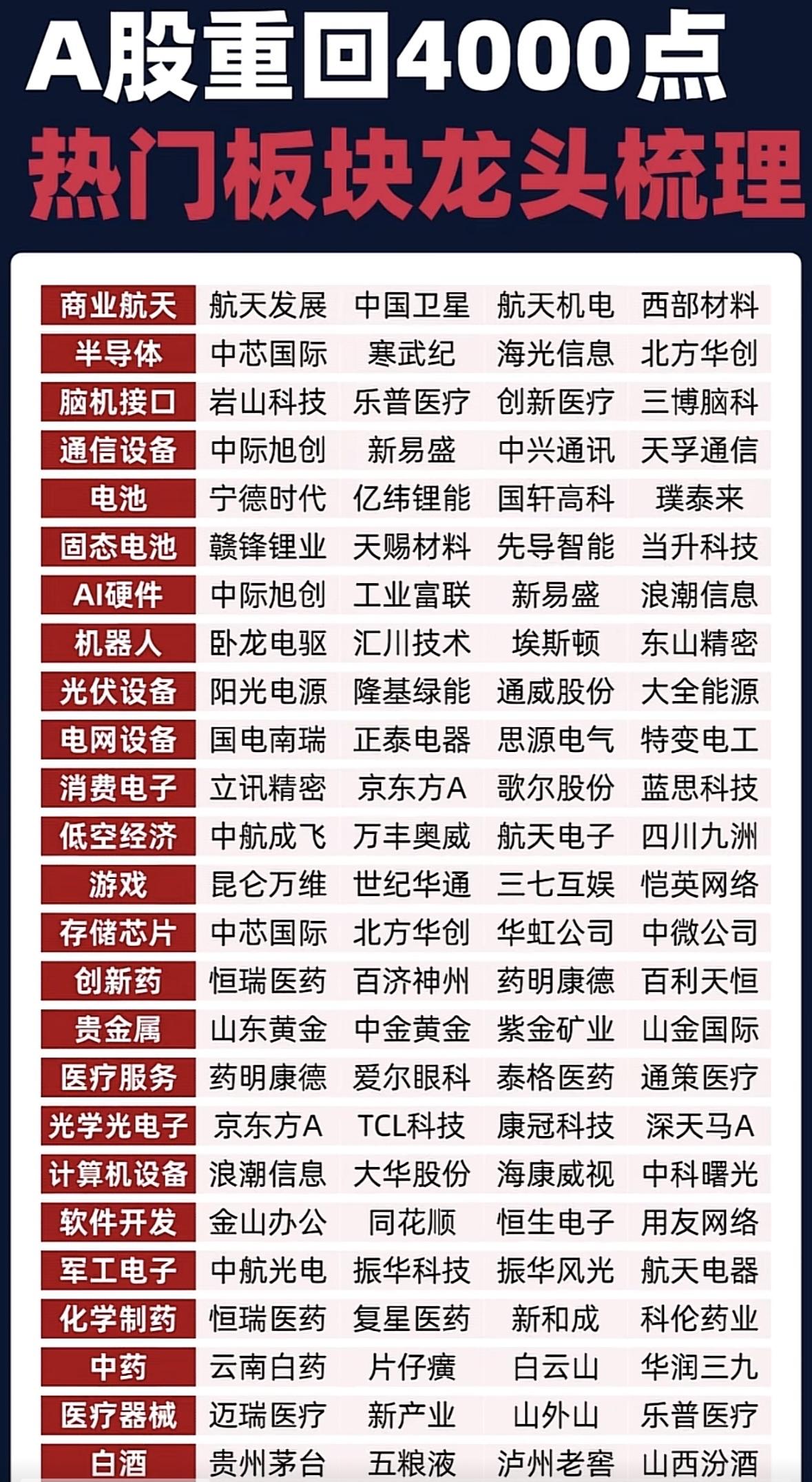 A股重回4000点,热门板块龙头梳理! A股热点板块龙头盘点:航天、半导体、AI硬件、创新药、白酒等赛道龙头股一览,把握投资风向标。
