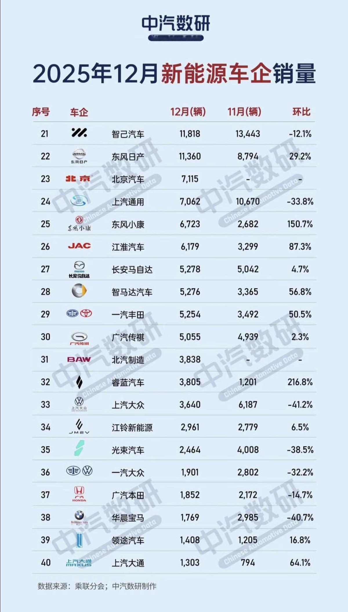 最新:25年12月 新能源车企 销量榜! 第一名:比亚迪 第二名:吉利 第三名:长安 第四名:特斯拉 第五名:奇瑞 除了特斯拉,环比是增长的,中国的四家新能源车企,环比都是下跌的! 总体销量趋势不乐观啊