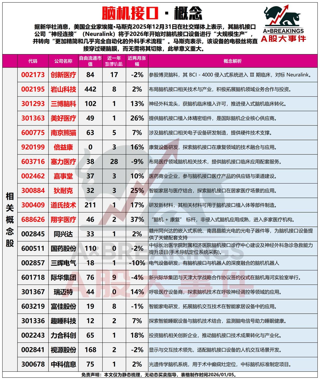 1月6日, 周二A股这些板块有望大涨!!! 马斯克在社交媒体表示,其脑机接口公司“神经连接”将于2026年开始脑机接口设备量产,重点关注:三博脑科、创新医疗、倍益康;ASIC平台续朝更高运算密度和频宽需求演进,重点关注:铜冠铜箔、诺德股份、圣泉股份!!!