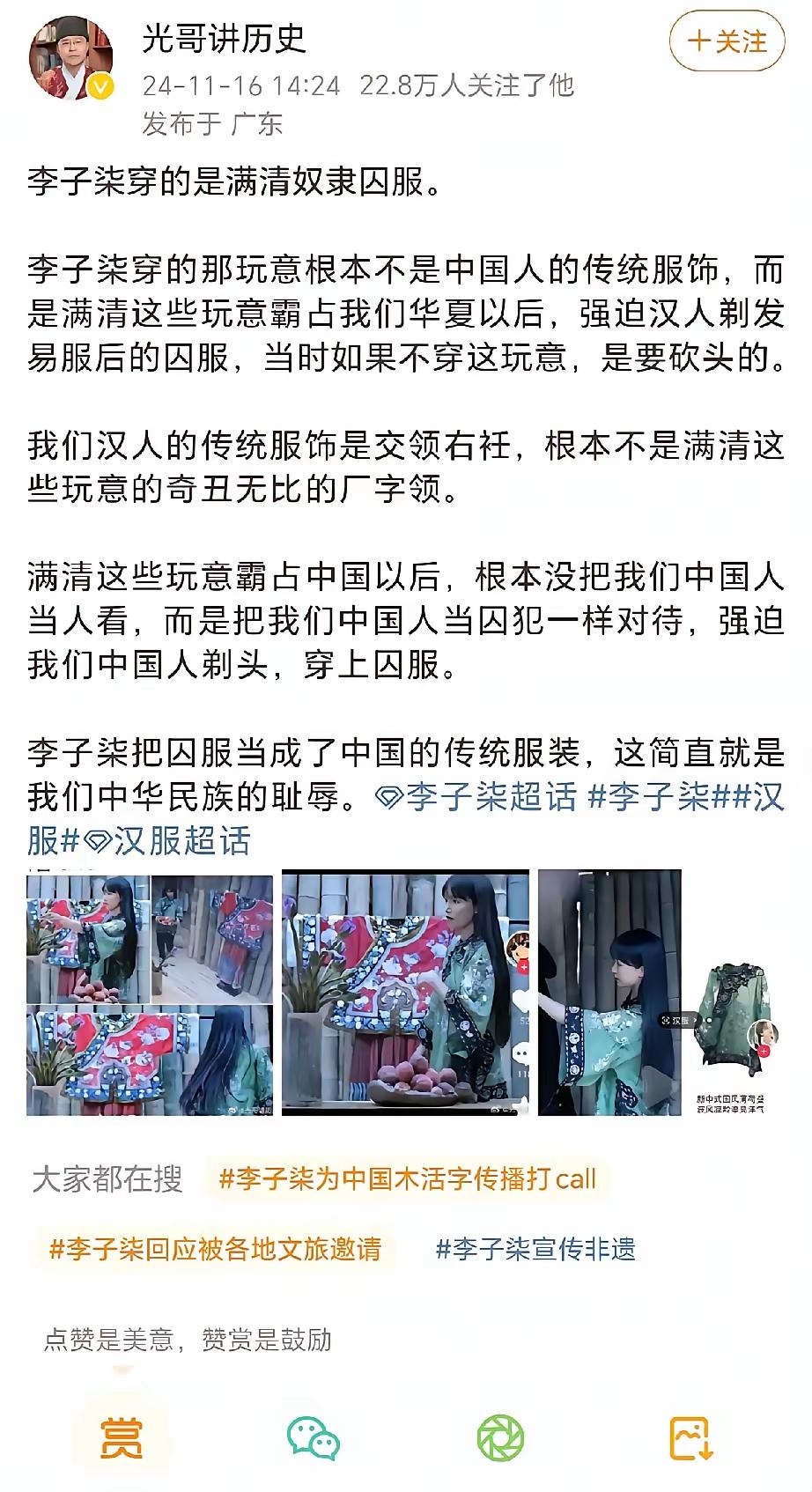没文化,真可怕, 李子柒复出不成功就是吃了没文化的亏。 她对明清历史了解不够多,做了一件满清的厂字襟,一股子满味。 就这怎么能称之为新中式,明明就是满式。 普通人可以不知道,也可以犯错,但是李子柒这么多年接触民族文化,做衣服之前肯定要研究了,还犯这种错误就太不应该了。 不过,我不认为李子柒是向满遗投诚,估计是被蒙蔽了,只要她接着做一件真正传统的汉服,我还是支持她的。 你们呢?