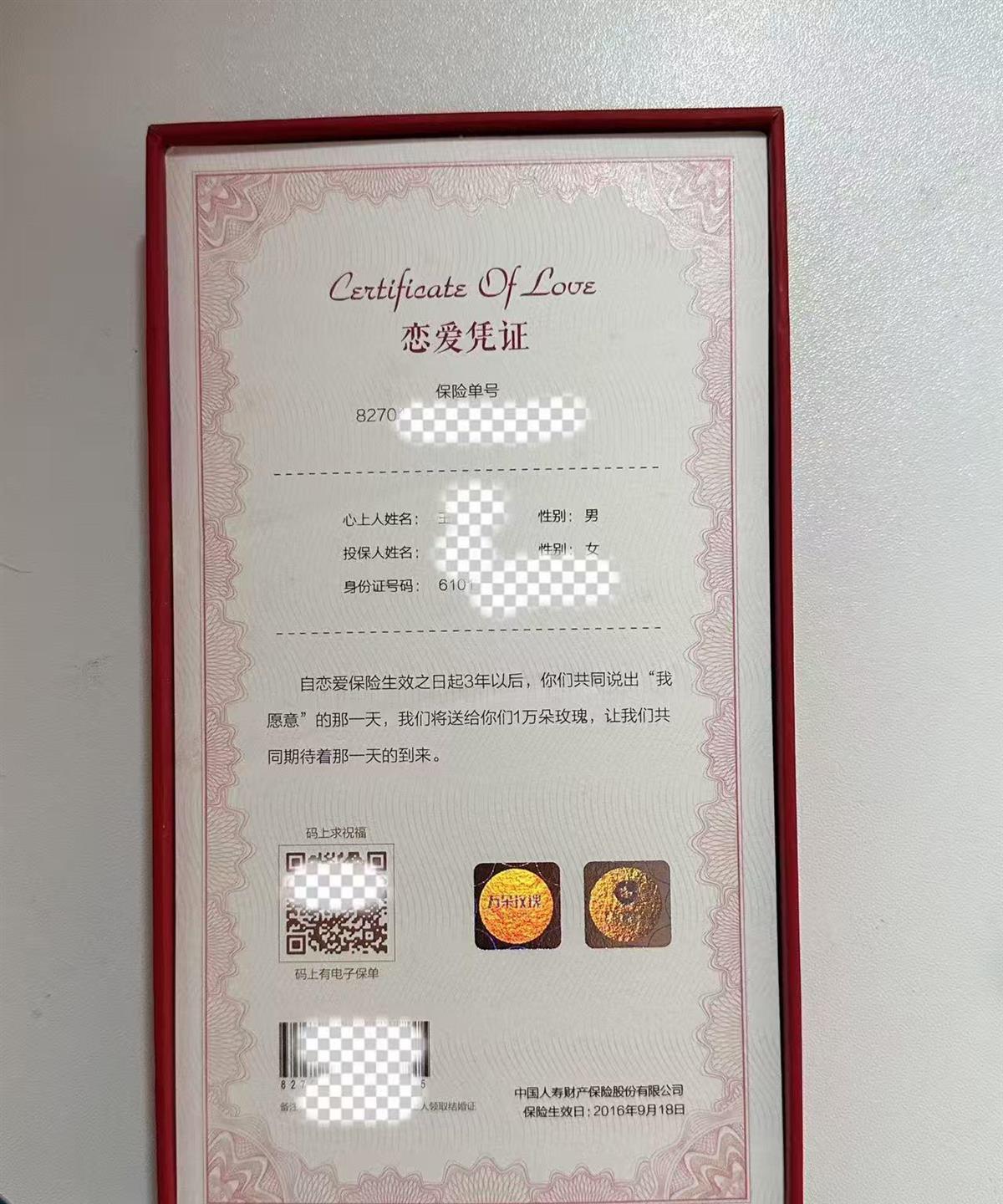199元赌十年爱情,1万元到手?真香还是噱头 1月3日晚,西安吴女士晒出恋爱保险准备兑现。2016年她花199元买,当时恋爱1年。约定生效满3年到10年内登记结婚,给1万元或10000朵玫瑰。两人2015相恋,2025年10月领证。今年2026,赶元旦办手续,选现金。王先生当年还以为是骗局。客服称1到2个工作日发邮件,提交材料,审核后打款。也有折戟,武汉刘女士室友2017买,工作两年后分手,没法兑。1月5日上午客服确认,这类产品2017年停卖,已售还能兑。好玩有趣,但终究是营销设计,能兑现是运气,别把爱情当投资。