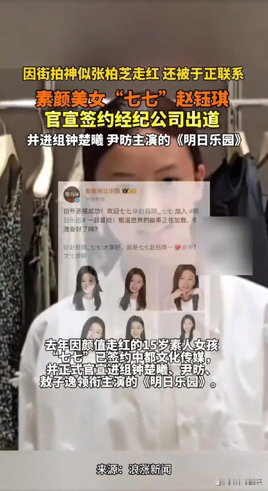 神似张柏芝的素颜美女七七出道网红小七七 15岁的河南南阳女孩“七七”,去年凭一段素颜街拍意外走红,被夸有“电影脸”,还神似年轻时的张柏芝、杨颖。很多网友喊话于正签约她,于正也让工作人员联系了,但后来见七七一家开始参加商场活动,又考虑到她要先完成学业,就决定不再联系。 如今“七七”签约中都文化传媒,还官宣进组《明日乐园》。中都文化传媒曾签下苏小玎、张雪迎等艺人。网友看法不一,有人恭喜,有人觉得跟于正会更好。不管怎样,希望“七七”在演艺路上能兼顾学业,走出自己的花路。