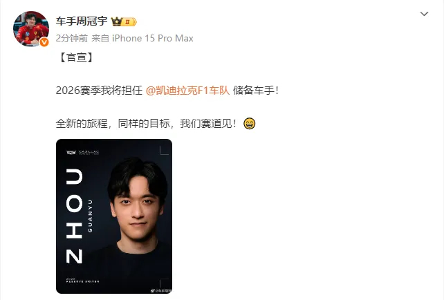 【官宣!#周冠宇正式加盟凯迪拉克F1车队# 】据凯迪拉克F1车队官方消息,周冠宇正式加盟凯迪拉克F1车队,在即将到来的2026赛季担任官方储备车手。随后,周冠宇发文称:2026赛季我将担任凯迪拉克F1车队储备车手!全新的旅程,同样的目标,我们赛道见。公开资料显示,周冠宇1999年5月30日出生于中国上海,中国一级方程式赛车运动员。2025年3月,周冠宇正式成为法拉利F1车队的储备车手。对于法拉利,周冠宇并不陌生。早在这名中国车手2014年驰骋在卡丁车赛场时,他就加入了法拉利车手学院,并在一年后获得意大利F4锦标赛年度亚军。去年重回法拉利之后,周冠宇也成为了首位加入法拉利F1车队的中国车手。