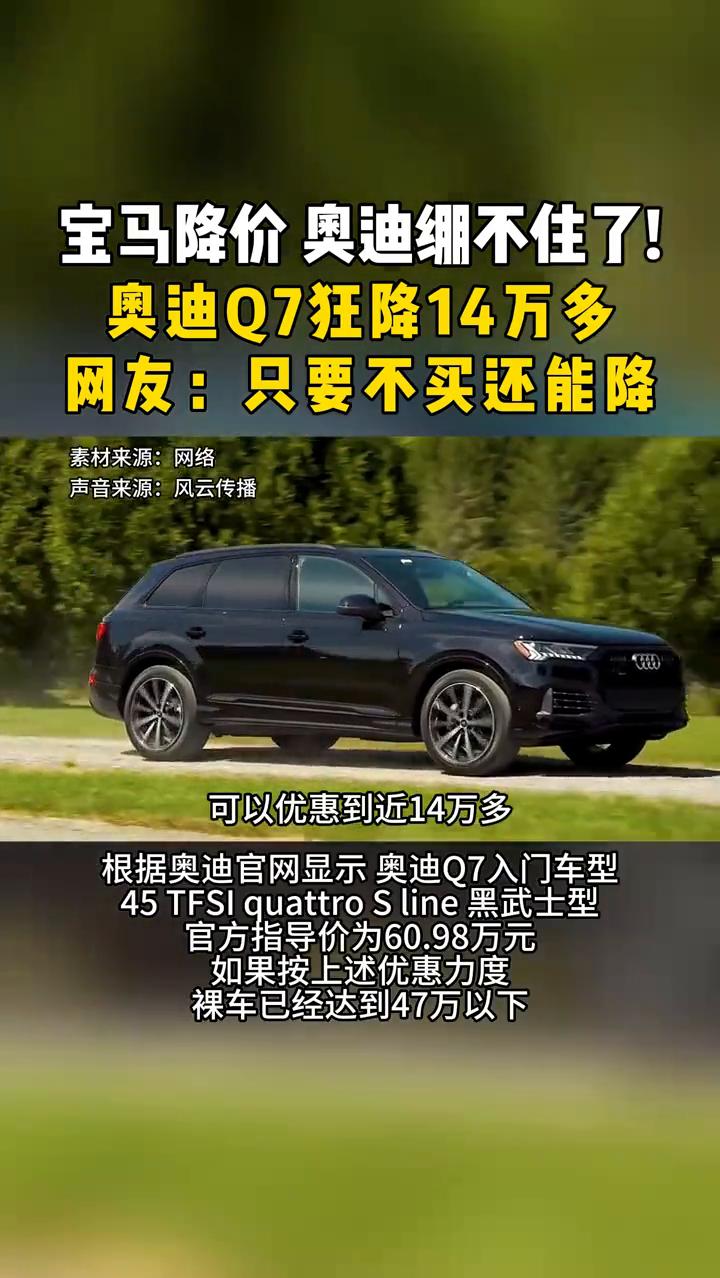 宝马降价奥迪绷不住了!奥迪Q7狂降14万多。网友:只要不买还能降。 东方卫视新闻主播叶子龙。 宝马最高要降价30万元,宝马中国回应了这场大范围降价,说这不是价格战。身后这款车子是奥迪Q7的黑武士,现在终端的优惠价格可以优惠到近14万多。这个价格现在一直在掉价,可能想着可能还会再掉。