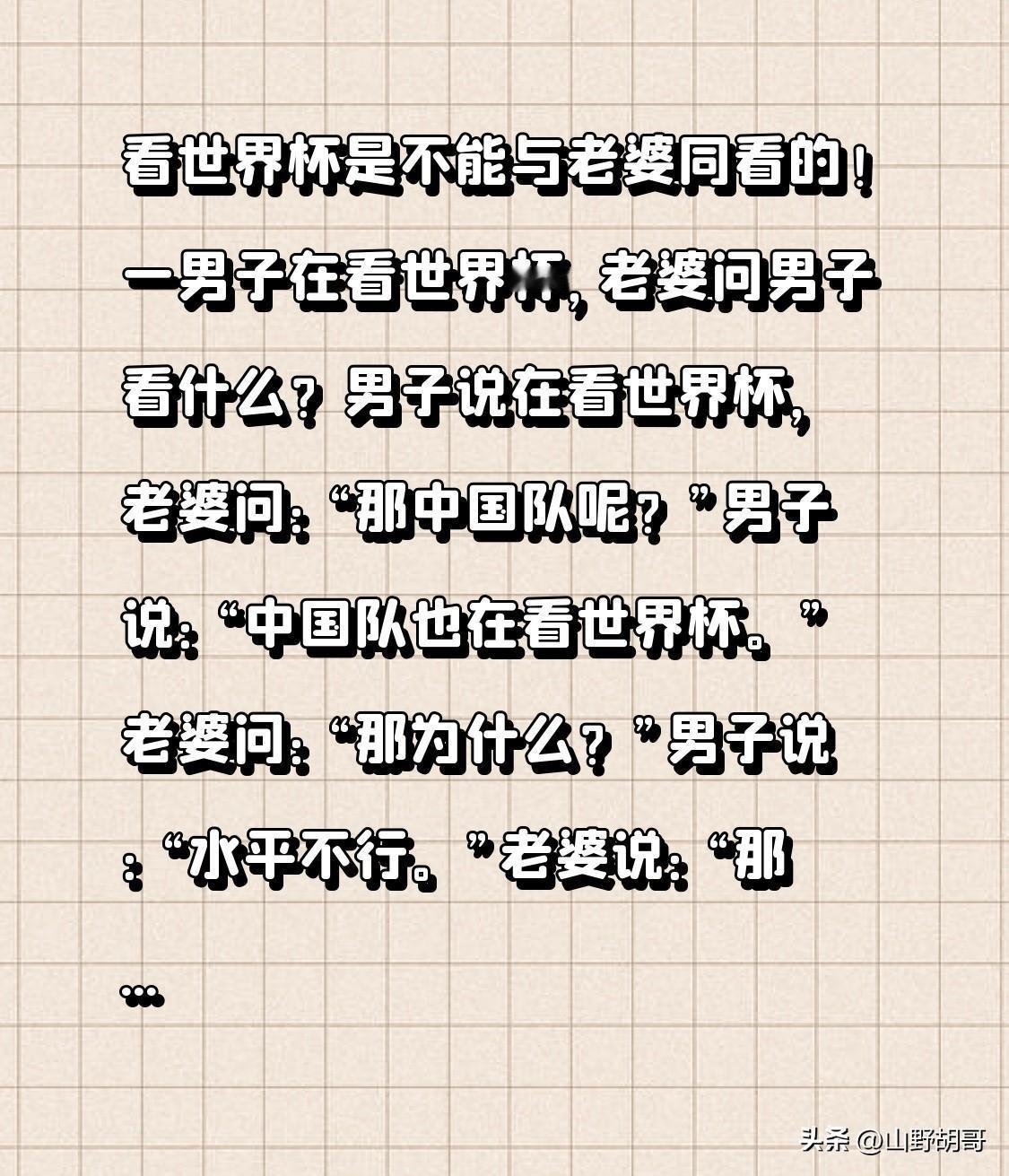 看世界杯是不能与老婆同看的!一男子在看世界杯,老婆问男子看什么?男子说在看世界杯,老婆问:“那中国队呢?”男子说:“中国队也在看世界杯。”老婆问:“那为什么?”男子说:“水平不行。”老婆说:“那怎么不让姚明、郎平上呢?”男子说:“他们俩有事。”老婆说:“那刘翔呢?刘翔也可以呀!”男子只好起身,“我不看了。”世界杯 世界杯观赛 球星看球赛 世界杯之论