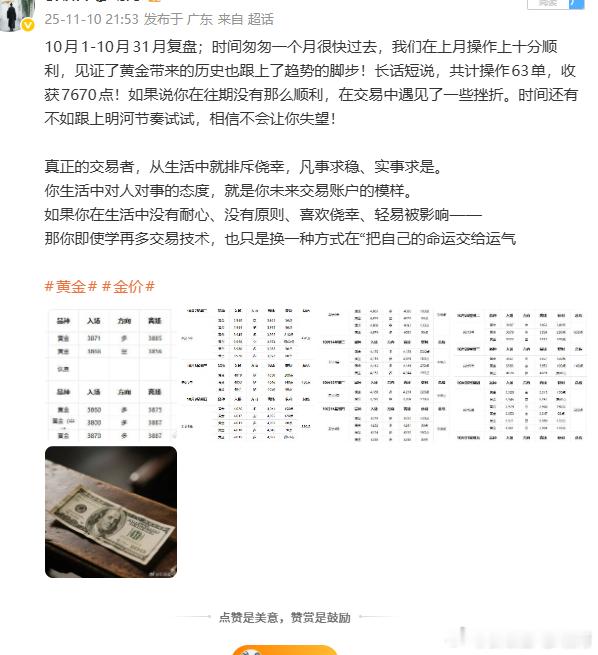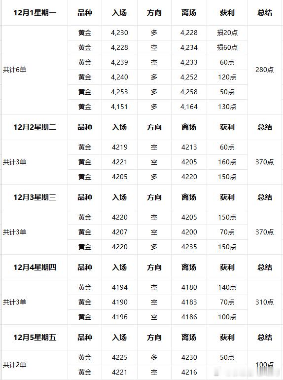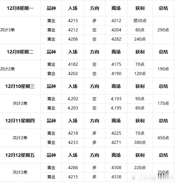 2025(年度总结);今年有遇到挫折,也有所收获!在上半年我第一个账号被封禁,对我打击很大。调整过来之后开始慢慢做这第二个账号。从最开始的几千粉到现在的几万!非常感谢之前一直关注支持我得老朋友,也非常感谢新关注过来的新伙伴!从高峰跌入低谷到目前重开始往上爬!对于这个市场的热爱,我从未减弱!一年以来几乎没有断更。每日坚持发布行情分析,以及短线思路!也帮助到不少朋友从亏损到盈利,从刚刚开始的小白到现在的老油条!黄金方面整年来说,蒸蒸日上!不断创下新高。对比前几年来说波幅要大的多机会也多的多,无论是波段的中线,还是一天的短线明河的准确率大家有目共睹!简单回顾从7月7日开始打理这个账号简单统计!2025.7.7-8.22月复盘 ;这两个月共计布局100单,拿下6680点收获!7月份的行情还算可以,但是在8月份是一个调整阶段计划较少整体横盘!2025.9.8-.9.29月复盘 ;这个月份行情开始波动,以一根大阳线收官,共计布局60单,拿下5120点收获!2025.10.1-10.31月复盘 ;10月份的行情延续了9月的多头力度不愧是作为金九银十的行情大月,共计布局63单,拿下7670点收获!2025.11.3-2026.1.2月复盘;11和12月放在一起是因为这两个月份节假日比较多行情方面在11月份属于一个宽幅震荡阶段,在12月中段才开始有所幅度!两个月共计操作145单,拿下17250点收获!简单按1标准手来算,也有着36720美刀,按汇率7rmb,也有257040rmb,当然付出越多,回报越多!新的一年开始,不想原地踏步在市场无所事事,甚至还有在亏损!不妨现在坚定上车,与我共创新的未来!黄金金价