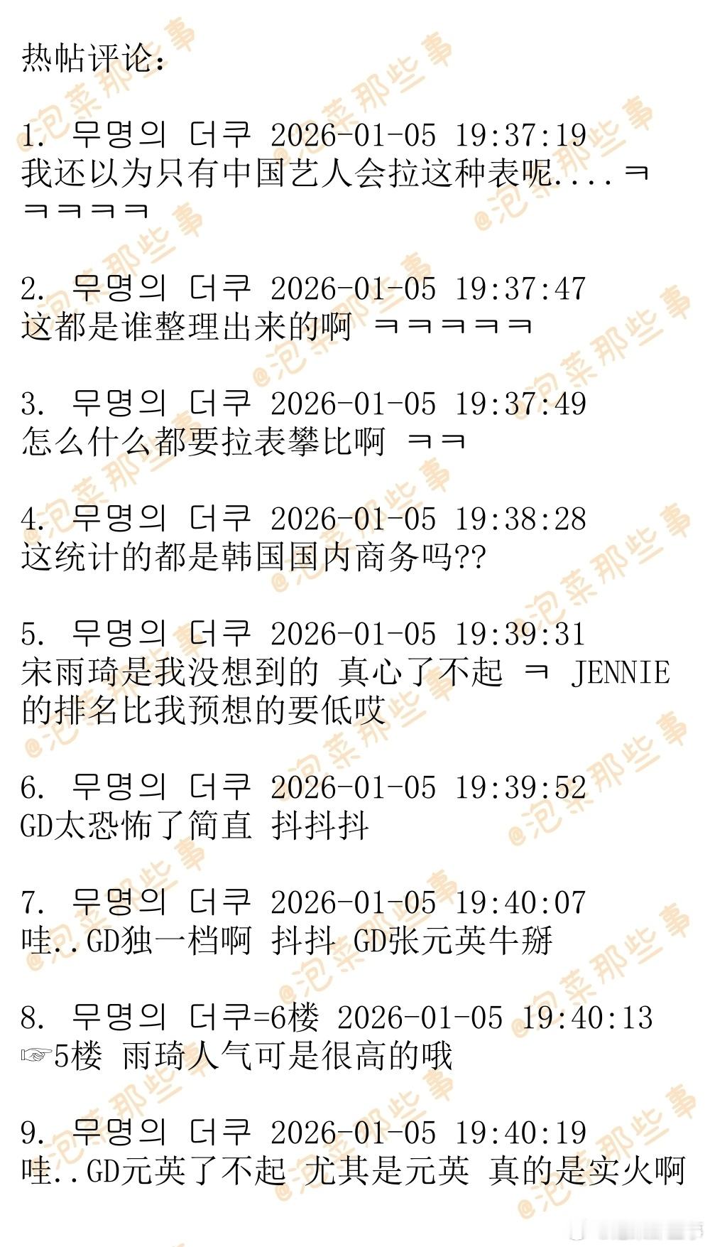 🔥韩网热帖评论翻译🔥2025年K-POP爱豆个人品牌代言及合作TOP101:BIGBANG G-Dragon权志龙 — 30个2:IVE 张元英 — 23个3:IU 李知恩 — 16个4(并列):i-dle 宋雨琦 — 15个4(并列):ASTRO 车银优 — 15个6:防弹少年团 Jin金硕珍 — 12个7:aespa Karina柳智敏 — 11个8(并列):Stray Kids Felix李龙馥 — 10个8(并列):BLACKPINK Jennie — 10个10:IVE 安宥真 — 9个cr.theqoo