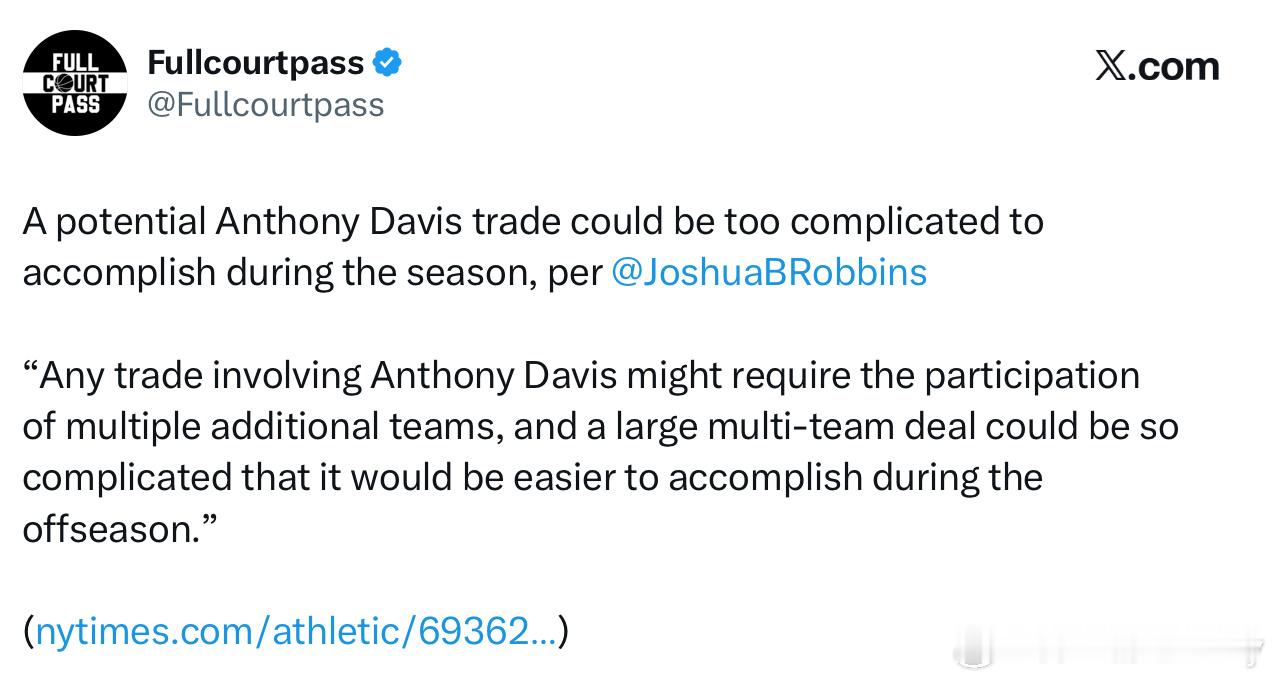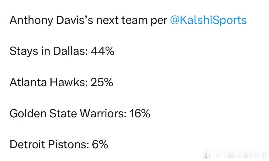 Josh Robbins:任何涉及浓眉的交易都需要多队参与,在截止日前完成交易将会非常复杂,因此在休赛期时完成更容易。此外,Kalshi Sports预测浓眉下家概率:独行侠44%老鹰25%勇士16%活塞6%