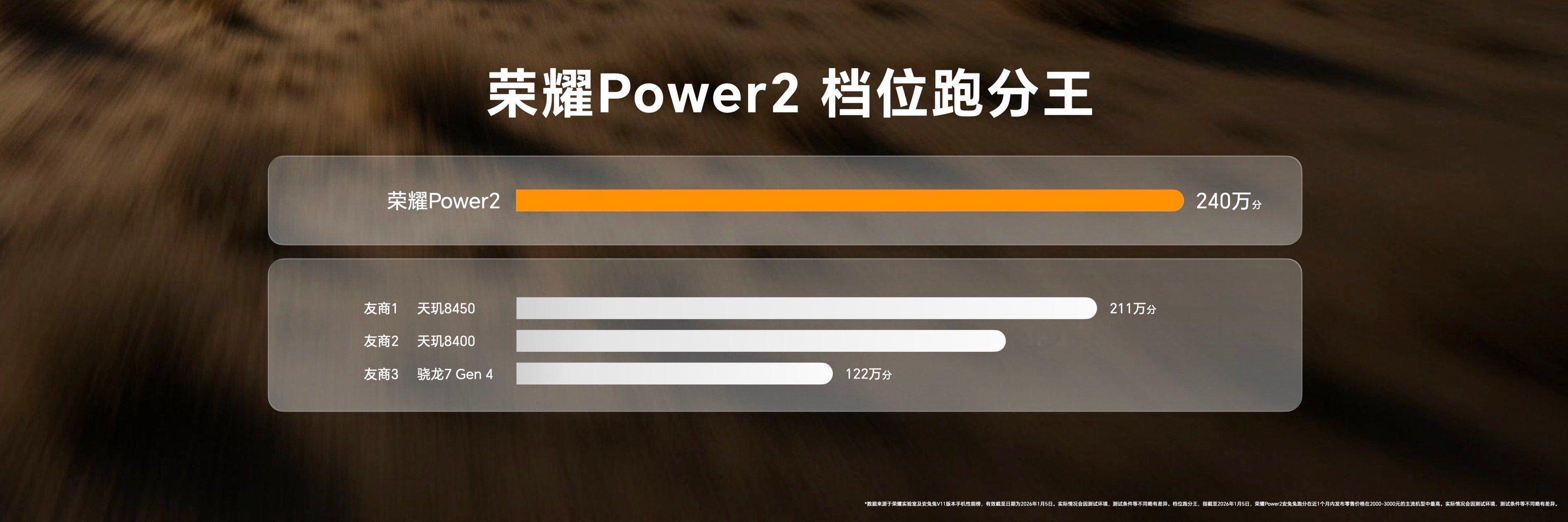 荣耀Power2防水方面,集齐IP68、IP69、IP69K满级防尘防水,采用四角榫卯卸力金属中框,抗摔能力提升25%,抗弯能力提升22%,并已通过金标五星整机抗跌耐摔+抗挤压认证。荣耀Power2搭载行业最大10080mAh青海湖电池,电池容量较前代提升26%。机身控制在约7.98mm的纤薄厚度与约216g的轻盈重量,并支持80W超级快充与27W反向充电荣耀Power2业界首创平行双轨天线设计,不仅大幅提升弱网通信能力,更实现了行业顶配的低频4天线架构,使弱网信号表现提升200%。荣耀Power2行业首发天玑8500Elite,其采用全大核的8核CPU,GPU性能提升25%,安兔兔跑分突破 240万分,荣耀自研幻影引擎也是有的!荣耀Power2搭载6.79英寸荣耀绿洲护眼屏,支持行业最高8000nits峰值亮度,更集成3840Hz高频PWM调光、硬件级低蓝光及AI晕动舒缓显示等护眼体验,有效缓解用眼疲劳与乘车眩晕。还带来AI户外模式贴心功能。开启AI户外模式后,可智能增强屏幕显示、优化网络与通话质量,并主动提醒天气变化,更支持一键返航指引荣耀 Power2还可以吧