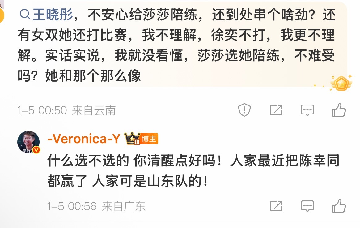 虽然12:50了 也不意味着可以说胡话了SYS何地位 还能“选”现在山东队没有主力队员在队内很明显山东的能量要开始往王晓彤身上注入了王晓彤(2000)只比刘炜珊(1999)小一岁青年赛也不出挑 还是“选调”入国家队的为什么王晓彤现在这么多比赛 刘炜珊查无此人户口太重要了!(天津和山东没法比)