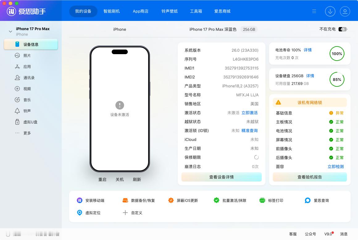 编号:53115 iPhone17ProMax 全新未激活 美版有锁 256G 蓝色 裸机 全新未激活 三星屏 6.9寸灵动岛大屏 A19Pro芯片 观感极佳 性能强悍 价格美丽 发货前改好超薄双卡 插卡即用 稳定支持双卡全网通5G 电池100 价格:6999