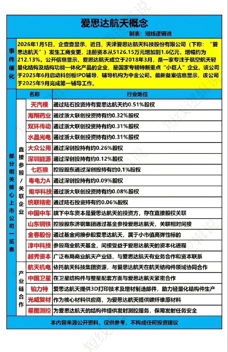 1月6日,周二A股这个板块有望大涨!!! 天津爱思达航天科技股份有限公司发生工商变更,注册资本从5126.15万增加到1.6亿,于25年6月启动科创板IPO辅导,重点关注:天汽模、双环传动、水晶光电 ,相关概念股有望异军突起!!!