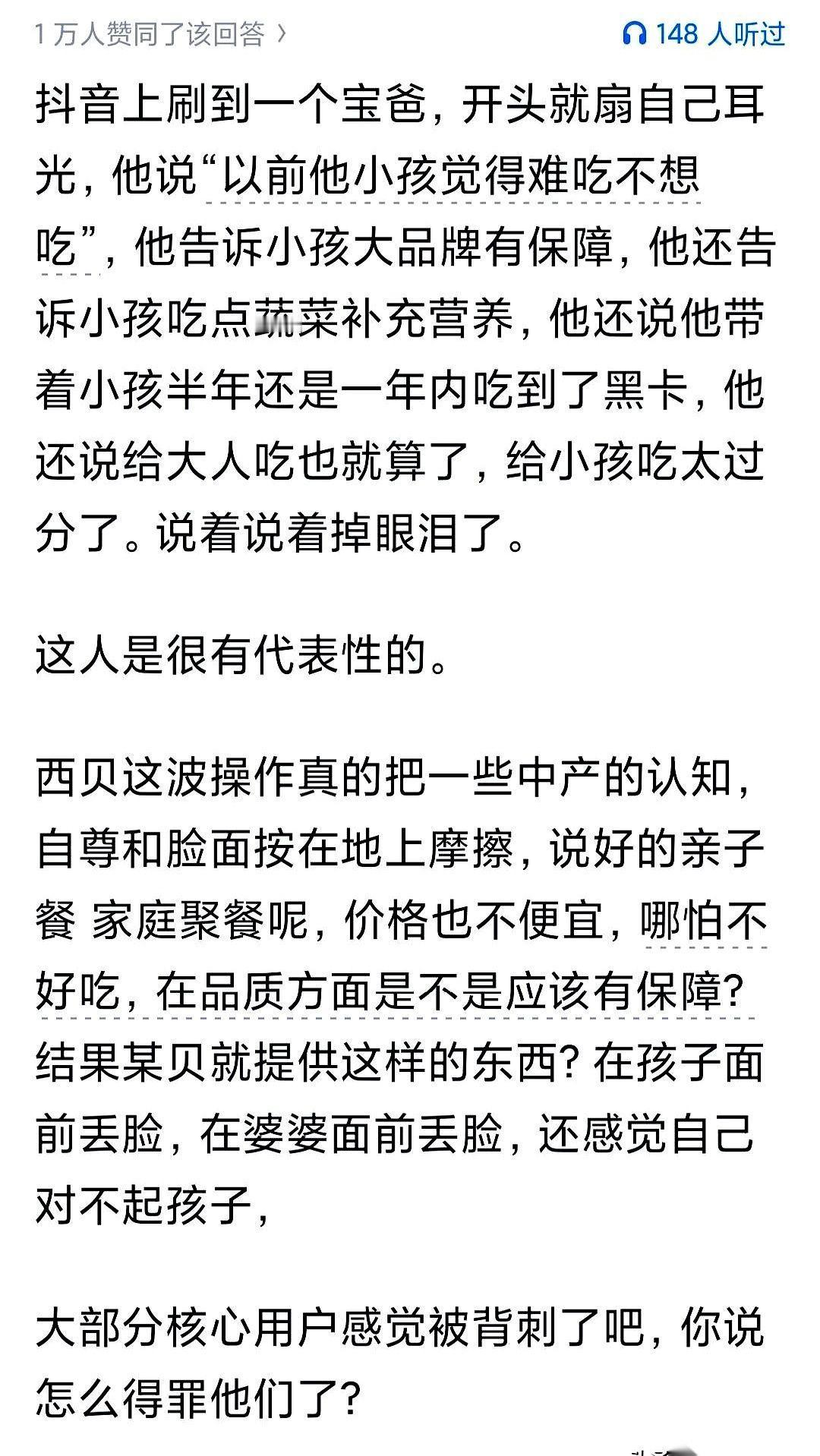 西贝这一出,最狠的不是打了谁的脸,是直接把我家的“餐桌宪法”给颠覆了。 真的,一点没开玩笑。 以前我,都市丽人,精致宝妈,坚信“专业的事交给专业的人”,花钱买健康,买放心。西贝,就是我的理论高地。 我婆婆呢,传统智慧的化身,永远一句“外面的东西哪有家里自己做的好”。为这事儿,我们俩明里暗里不知道交锋了多少回合。 结果,罗永浩一嗓子,好家伙。 我花大几百请全家吃的“健康大餐”,搞了半天是个加热料理包。 我当时就感觉脸上火辣辣的。 这事儿吧,说白了跟预制菜本身没多大关系。 你要是卖个快餐的价,谁管你是不是预制菜?方便快捷还不用刷碗,谢谢您嘞。 问题是,你收着手工现做的钱,营造着后厨热火朝天的氛围,端上来的却是工业流水线的东西。 这叫什么? 这不叫欺负老实人吗。 你卖的不是菜,你卖的是一种“中产阶级的美好想象”。我们愿意为这个“想象”买单,结果你告诉我这想象是假的。 现在好了,我在家彻底丧失了对“吃什么”的建议权。 我婆婆现在在厨房里,腰杆挺得都比我直。 一句话都不用说,那眼神里全是:“你看,我说的没错吧?”