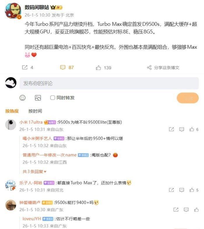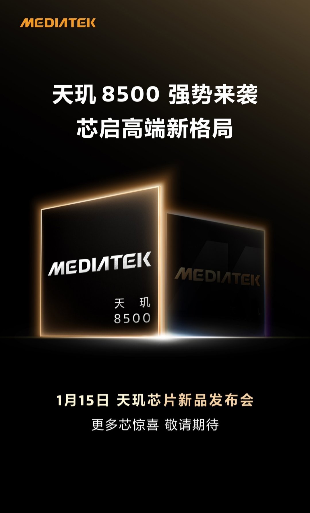 【8500、9500s 双芯齐发?2026 联发科天玑芯片新品发布会官宣 1 月 15 日举行】根据联发科官方预热,其中一款新品是天玑 8500 芯片。根据博主 数码闲聊站 的爆料,联发科天玑 8500 芯片的规格如下:台积电 4nm,8 核 A725 全大核架构,目前样机测试超大核主频是 3.4GHz,大核频率也有提升;Mali-G720 GPU 好像加规模了,频率 1.5GHz±,ISP 和外围有一定升级,安兔兔跑分 220W±,GPU 理论性能超过骁龙 8G3/8s Gen4,中端性能芯。另一款芯片官方暂未公布,不过推断为天玑 9500s。博主 数码闲聊站爆料称,今年 Turbo 系列产品力继续升档(预计指 REDMI Turbo 系列手机),Turbo Max 确定首发 D9500s(天玑 9500s 处理器),满配大缓存 + 超大规模 GPU,妥妥正统旗舰芯,性能预估对标骁龙 8E、稳压骁龙 8G5 处理器。而 REDMI Turbo 5 Max 手机官宣本月到来,从时间点来看与此次联发科发布会能够对应得上