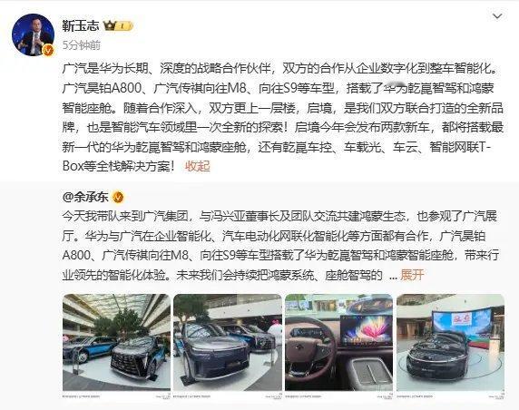【靳玉志:启境两款新车都将搭载最新一代华为乾崑智驾】华为靳玉志宣布,启境品牌明年将发布两款新车,都将搭载最新一代的华为乾崑智驾和鸿蒙座舱。不仅如此,启境新车还采用了乾崑车控、车载光、车云、智能网联T-Box等全栈解决方案。靳玉志还表示:广汽是华为长期、深度的战略合作伙伴,双方的合作从企业数字化到整车智能化。广汽昊铂A800、广汽传祺向往M8、向往S9等车型,搭载了华为乾崑智驾和鸿蒙智能座舱。随着合作深入,双方更上一层楼,启境,是我们双方联合打造的全新品牌,也是智能汽车领域里一次全新的探索。据CNMO了解,启境今年将推出的两款车中有一款被誉为“华系最美猎装轿跑”。该车已经完成极端环境测试与设计定型,预计将在今年6月正式上市交付。靳玉志指出,两支团队秉持“绝不妥协”的态度,在造型设计、驾驶性能和智能交互等方面全面发力。这款车型不仅以美学设计为核心,更结合了行业顶尖智能化技术,为用户提供安全、愉悦且前沿的驾乘体验。另一款车型则计划于今年年中进入市场。启境品牌CEO刘嘉铭透露,华为乾崑与启境团队建立了高效联动机制,通过精准的用户洞察,将各自优势资源进行了深度整合。从造型优化到底盘调校,从智能交互升级到全维度安全体系搭建,双方始终保持紧密协作。尽管初期因视角差异产生了一些观点碰撞,但这些分歧反而成为挖掘潜在需求和创新思路的契机,最终转化为推动产品质量提升的动力。