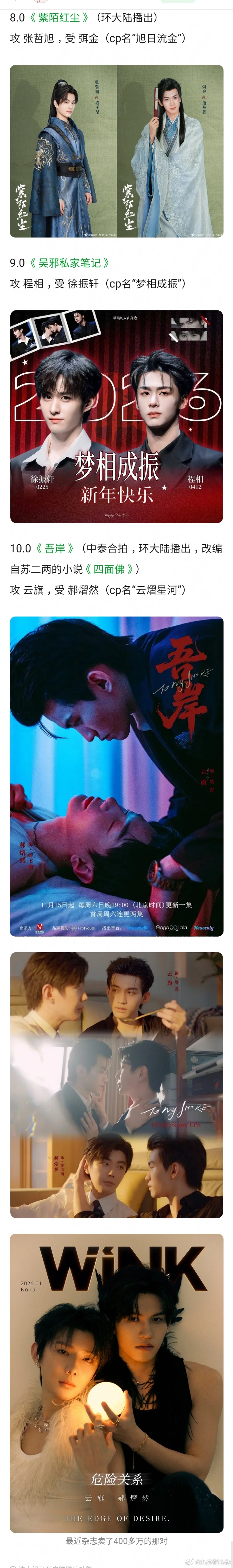 都到10.0了不科普完全不认识。。8.0 《紫陌红尘》(环大陆) 张哲旭 弭金(cp名“旭日流金”)9.0 《吴邪私家笔记》程相 徐振轩(cp名“梦相成振”)10.0 《吾岸》(中泰环大陆,《四面佛》)云旗 郝熠然(cp名“云熠星河”)